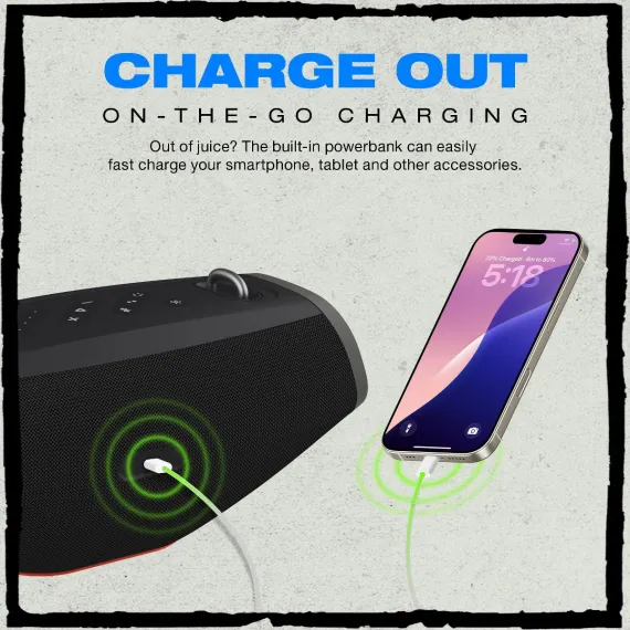 With Bluetooth 5.3, you get a fast, stable wireless connection every time, while the lossless USB-C audio input lets you plug your phone, tablet, or other device directly into the speaker for zero-lag, full-clarity playback. Rated IPX7 waterproof, this rugged outdoor speaker handles splashes, rain, and even full submersion for up to 30 minutes — so it’s never sidelined by weather or spills.