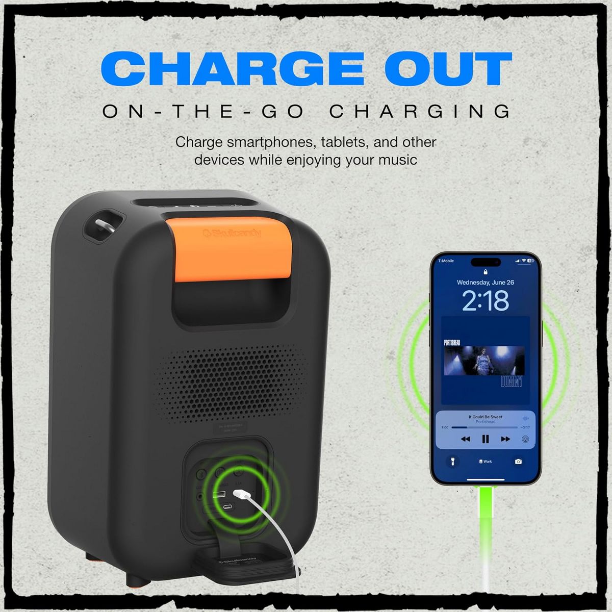 Get ready to take your party to the next level with the Skullcandy Stomp Bluetooth Speaker. This portable speaker is not your regular sound system, it's a portable party machine! With its waterproof design, it's perfect for outdoor use, whether you're throwing a beach party, hiking, camping or just chilling in the backyard. The IPX7 waterproof rating means you don't have to worry about a sudden rainstorm ruining your sound. With the Skullcandy Stomp, you also get to enjoy a mesmerizing LED lightshow that can add a dynamic, festive touch to any event. The multi-function LED lights can dance to the beat of your music, setting the mood for a memorable night. But don't worry about running out of power. Our portable bluetooth speaker comes with a 12-hour battery life to keep the music playing all day or all night long. If your phone or other devices are running low on battery, you can simply plug them into the USB-C or USB-A output for a quick charge. The Skullcandy Stomp Bluetooth Speaker is designed for portability. Its built-in carrying handle is designed for you to easily take your music with you wherever you go. Plus, with the unique Multi-Link functionality, you can connect your Stomp to up to 99 other Skullcandy bluetooth speakers for an even bigger sound experience. The Skullcandy Stomp is everything you need for a great outdoor party. It's a portable speaker, it's a waterproof speaker, it's an outdoor speaker, it's a Skullcandy Stomp speaker. It's all these and more. So, why wait? Start your party with a bang with the Skullcandy Stomp Speaker!