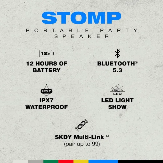 Skullcandy Stomp Bluetooth Speaker – IPX7 Waterproof Wireless Portable Speaker, with LED Lightshow & Strobe Modes, 12 Hour Battery, Multi-Link