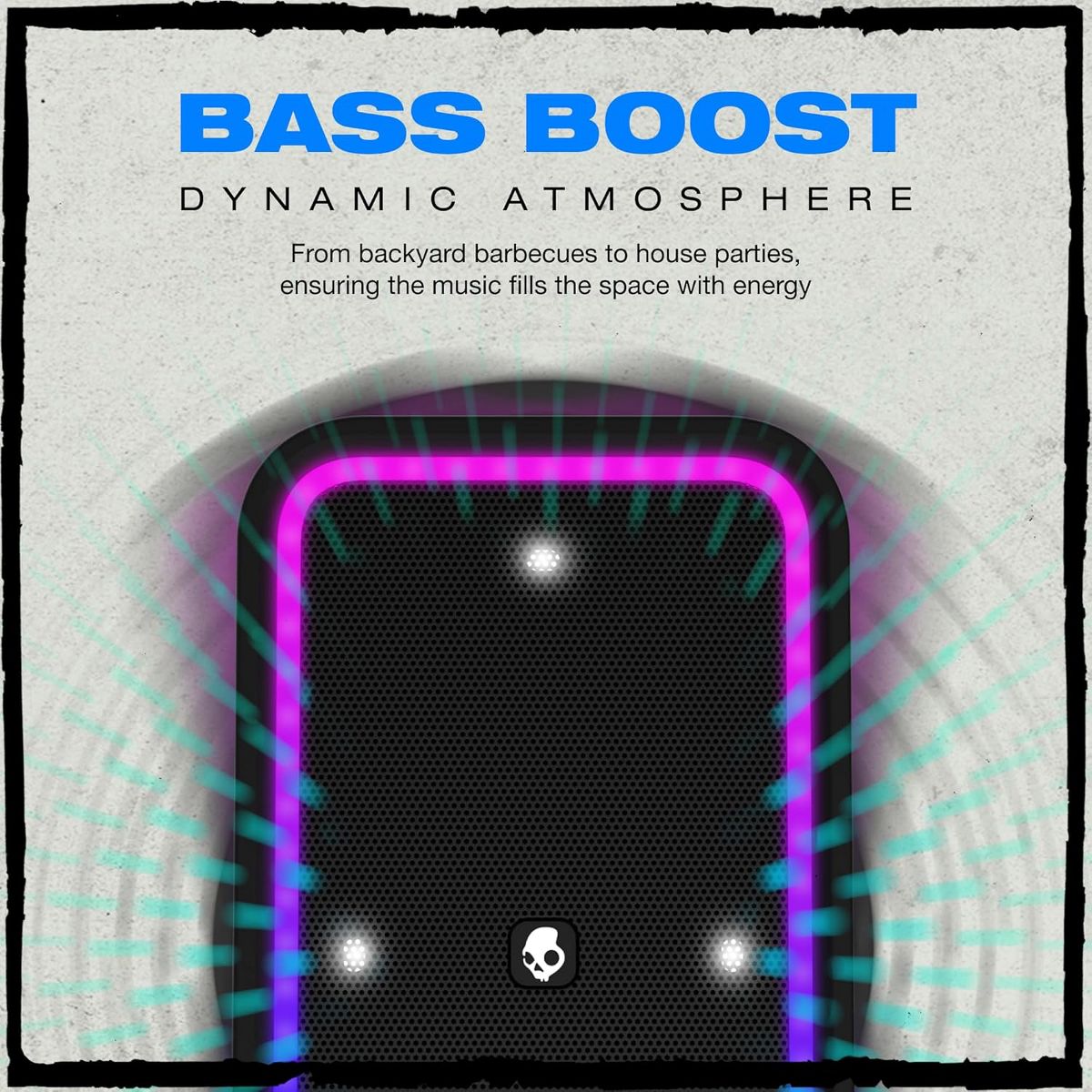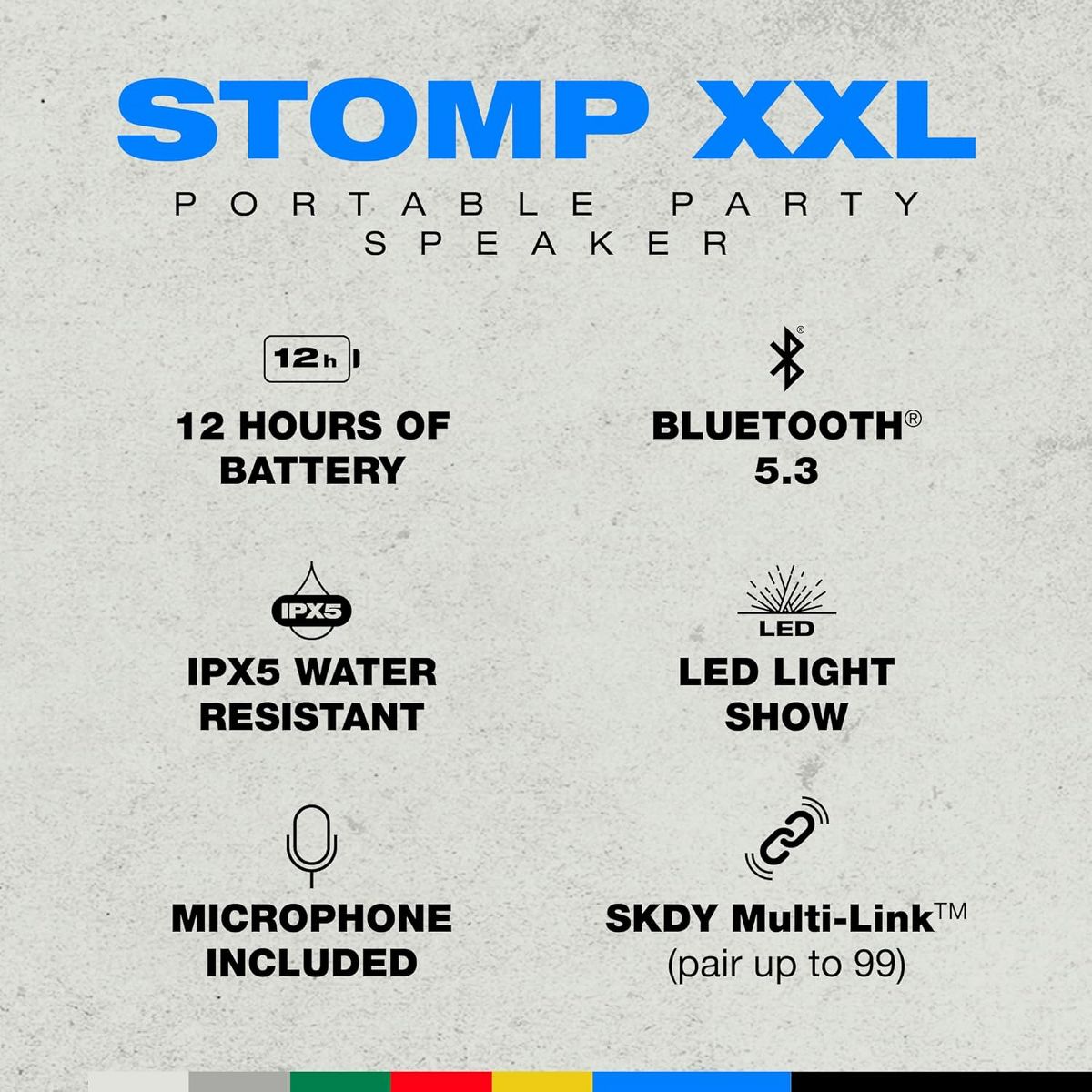 Block Party on Wheels: Most outdoor speakers fall flat, but this wireless beast brings it all—bright highs, rich mids, and punchy bass boosted to the max. Crank it up and feel the vibes! IPX5 Splashproutdoor Speaker: There’s no need to pack up the music if a little rain threatens your outdoor party — Stomp XXL can handle it. With an IPX5 splash proof rating, it can be caught in a full-on downpour and come out cranking. Plenty Loud for any Crowd: Is your small gathering turning into a 5-alarm rager? With a simple press of a button, Multi-Link can connect up to 99 other Skullcandy Bluetooth speakers, so it can handle any size room and any number of people. Stomp XXL also features an LED light bar & strobe light that syncs wit the music to bring the beats to life. Long-Lasting Battery & USB Charge Out: With up to 12 hours of battery life, the Stomp XXL wireless Bluetooth(tm) speaker keeps the party going all night long and won’t end the party with an awkward silence. It also has USB-C & USB-A charging output so that your mobile devices can always stay charged. Take the Party Anywhere: Stomp XXL is your portable Bluetooth speaker with built-in wheels and a carry handle for easy cruising. Roll out and rock your tunes wherever, whenever!