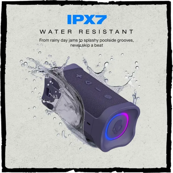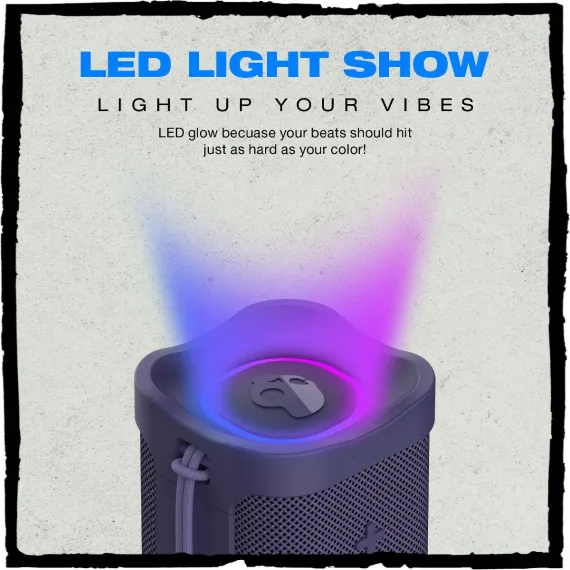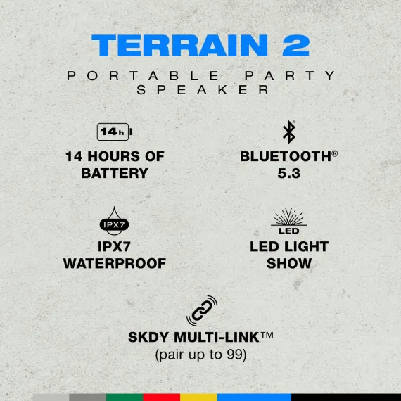 Experience incredible sound and bold features with the Skullcandy Terrain 2 Wireless Bluetooth Speaker. This compact and portable speaker is designed to keep up with your active lifestyle, delivering powerful audio and seamless connectivity wherever you go. The IPX7 water-resistant design makes it perfect for beach days, poolside hangouts, or outdoor adventures, ensuring your music keeps playing no matter the conditions. The Terrain 2 features Bluetooth 5.3 for a reliable connection, while its multi-link technology allows you to link up to 99 speakers for an immersive sound experience that fills any space. Enjoy a stunning visual element with LED lights that sync to your music, creating a captivating light show to enhance every song. Boasting a 14-hour battery life, the Terrain 2 keeps your playlist going all day long, whether you're hiking, relaxing, or celebrating with friends. Its lightweight design makes it easy to carry, while the rich, powerful bass ensures your favorite tracks sound better than ever. Ready to elevate your music experience? Order the Skullcandy Terrain 2 Wireless Bluetooth Speaker today and take your sound wherever you go!