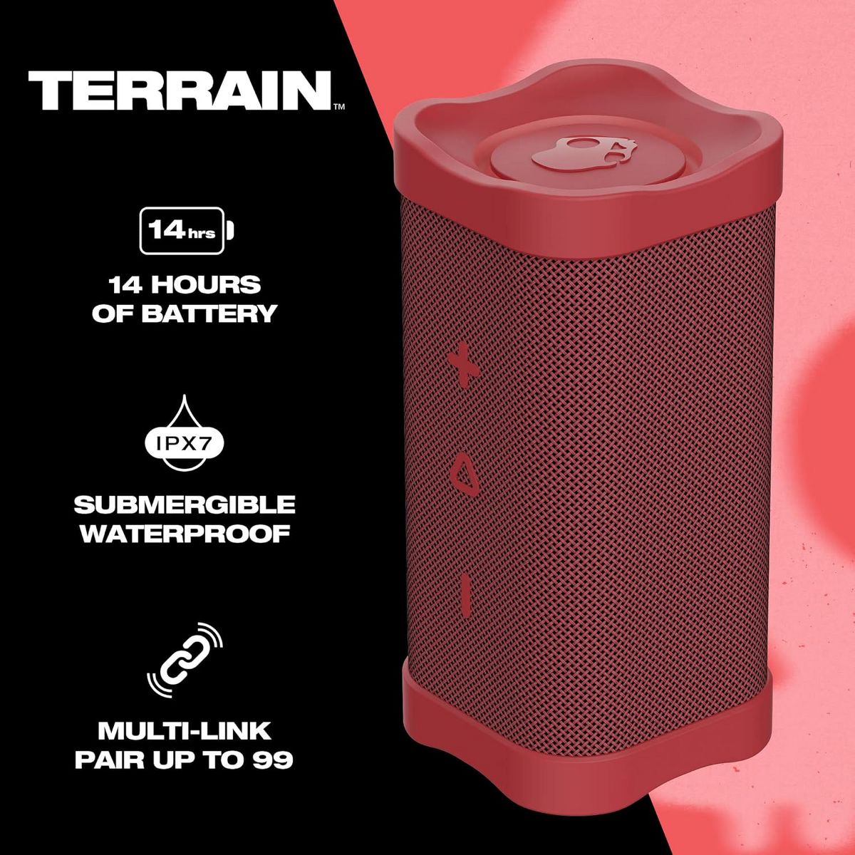 Introducing the Terrain Wireless Bluetooth Speaker by Skullcandy - the ultimate wireless speaker & must-have for music lovers! Our waterproof Bluetooth speaker has an IPX7 Waterproof rating, and can withstand 3 feet immersion for 30 minutes, making it an ideal beach essential for vacation. Two custom passive radiators create a powerful bass punch, while the waterproof woven fabric mesh allows maximum range of audio waves to pass through. The Terrain Wireless Bluetooth Speaker features Skullcandy Multi-Link that allows you to wireless connect up to 99 SKDY speakers for a party! With its 14-hour battery, you can enjoy your music all day long without worrying about running out of juice. This portable Bluetooth speaker also comes with a 3 ft C-to-A charging cable and nylon wrist wrap for easy portability. You can also connect to two devices at once and easily switch between the audio source with just one click of a button. Don't miss out on this small Bluetooth speaker that packs a powerful punch! Add the Skullcandy Terrain to your summer essentials and experience one of the best wireless speakers on the market. Get yours today!