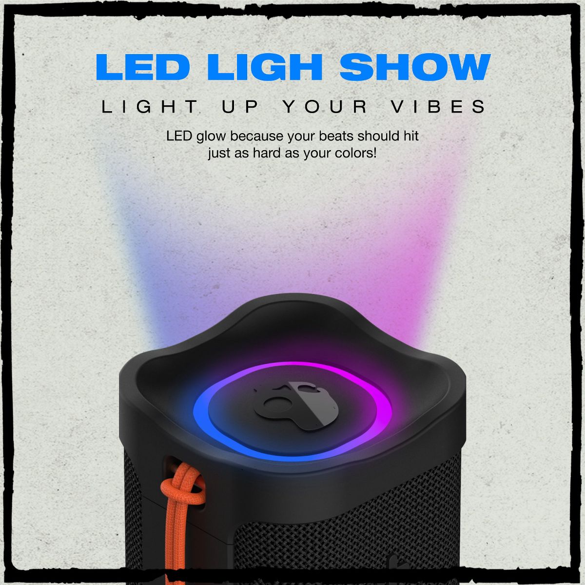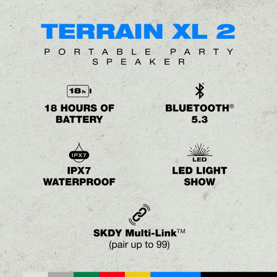 Experience incredible sound and bold features with the Skullcandy Terrain XL 2 Wireless Bluetooth Speaker. This compact and portable speaker is designed to keep up with your active lifestyle, delivering powerful audio and seamless connectivity wherever you go. The IPX7 water-resistant design makes it perfect for beach days, poolside hangouts, or outdoor adventures, ensuring your music keeps playing no matter the conditions. The Terrain XL 2 features Bluetooth 5.3 for a reliable connection, while its multi-link technology allows you to link up to 99 speakers for an immersive sound experience that fills any space. Enjoy a stunning visual element with LED lights that sync to your music, creating a captivating light show to enhance every song. Boasting an 18-hour battery life, the Terrain XL 2 keeps your playlist going all day long, whether you're hiking, relaxing, or celebrating with friends. Its lightweight design makes it easy to carry, while the rich, powerful bass ensures your favorite tracks sound better than ever. Ready to elevate your music experience? Order the Skullcandy Terrain XL 2 Wireless Bluetooth Speaker today and take your sound wherever you go!