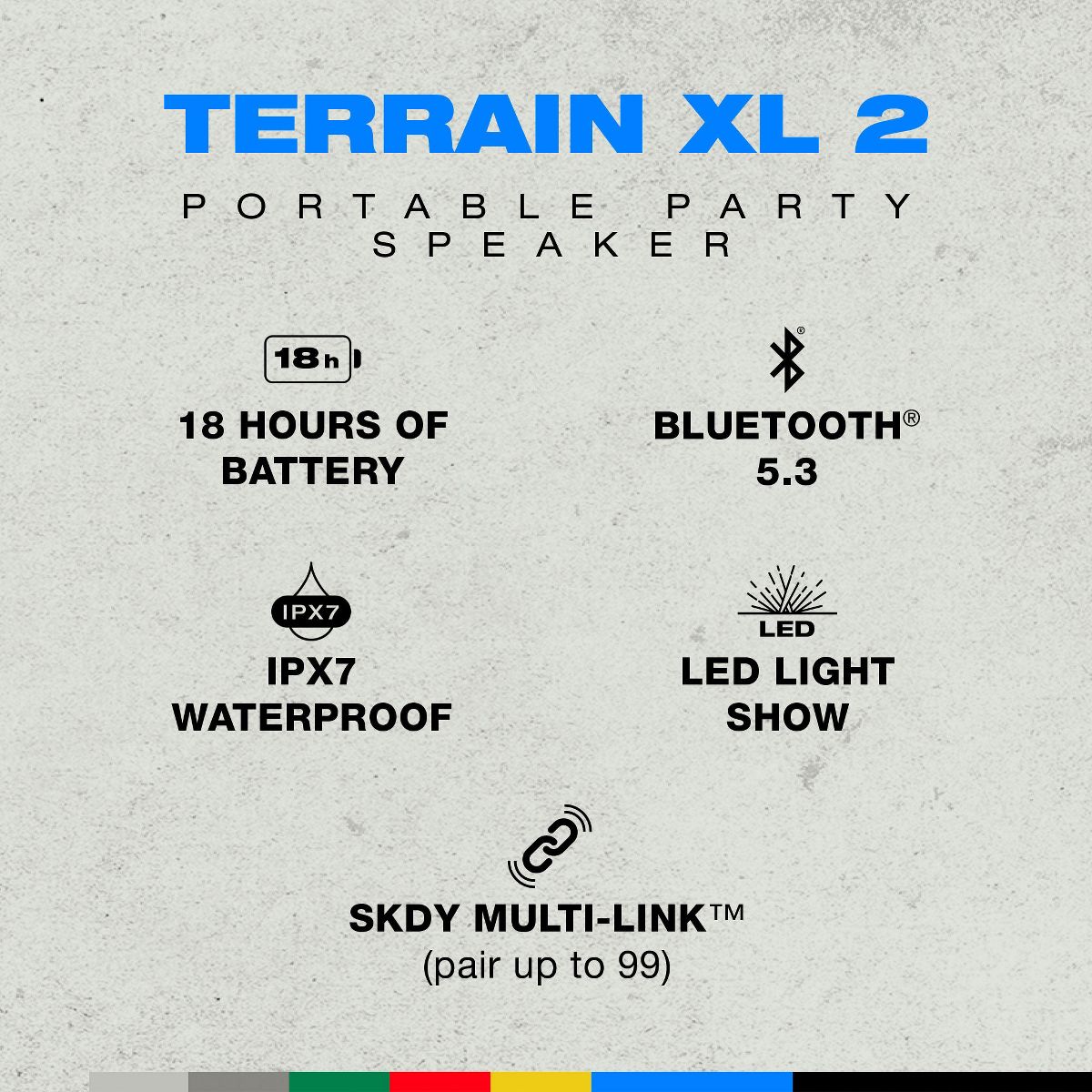 Experience incredible sound and bold features with the Skullcandy Terrain XL 2 Wireless Bluetooth Speaker. This compact and portable speaker is designed to keep up with your active lifestyle, delivering powerful audio and seamless connectivity wherever you go. The IPX7 water-resistant design makes it perfect for beach days, poolside hangouts, or outdoor adventures, ensuring your music keeps playing no matter the conditions. The Terrain XL 2 features Bluetooth 5.3 for a reliable connection, while its multi-link technology allows you to link up to 99 speakers for an immersive sound experience that fills any space. Enjoy a stunning visual element with LED lights that sync to your music, creating a captivating light show to enhance every song. Boasting an 18-hour battery life, the Terrain XL 2 keeps your playlist going all day long, whether you're hiking, relaxing, or celebrating with friends. Its lightweight design makes it easy to carry, while the rich, powerful bass ensures your favorite tracks sound better than ever. Ready to elevate your music experience? Order the Skullcandy Terrain XL 2 Wireless Bluetooth Speaker today and take your sound wherever you go!