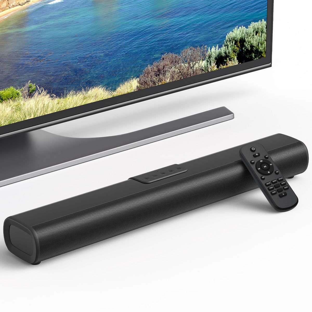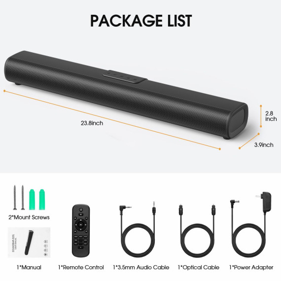 Upgrade your home entertainment experience with this powerful 50W soundbar, delivering rich stereo sound with dual full-range speakers. Whether wall-mounted or placed on a cabinet, it seamlessly fits into any room. With Bluetooth 5.0 and multiple input options, this soundbar connects to TVs, laptops, projectors, and more. Enjoy immersive audio with dedicated sound modes for music, movies, and news
