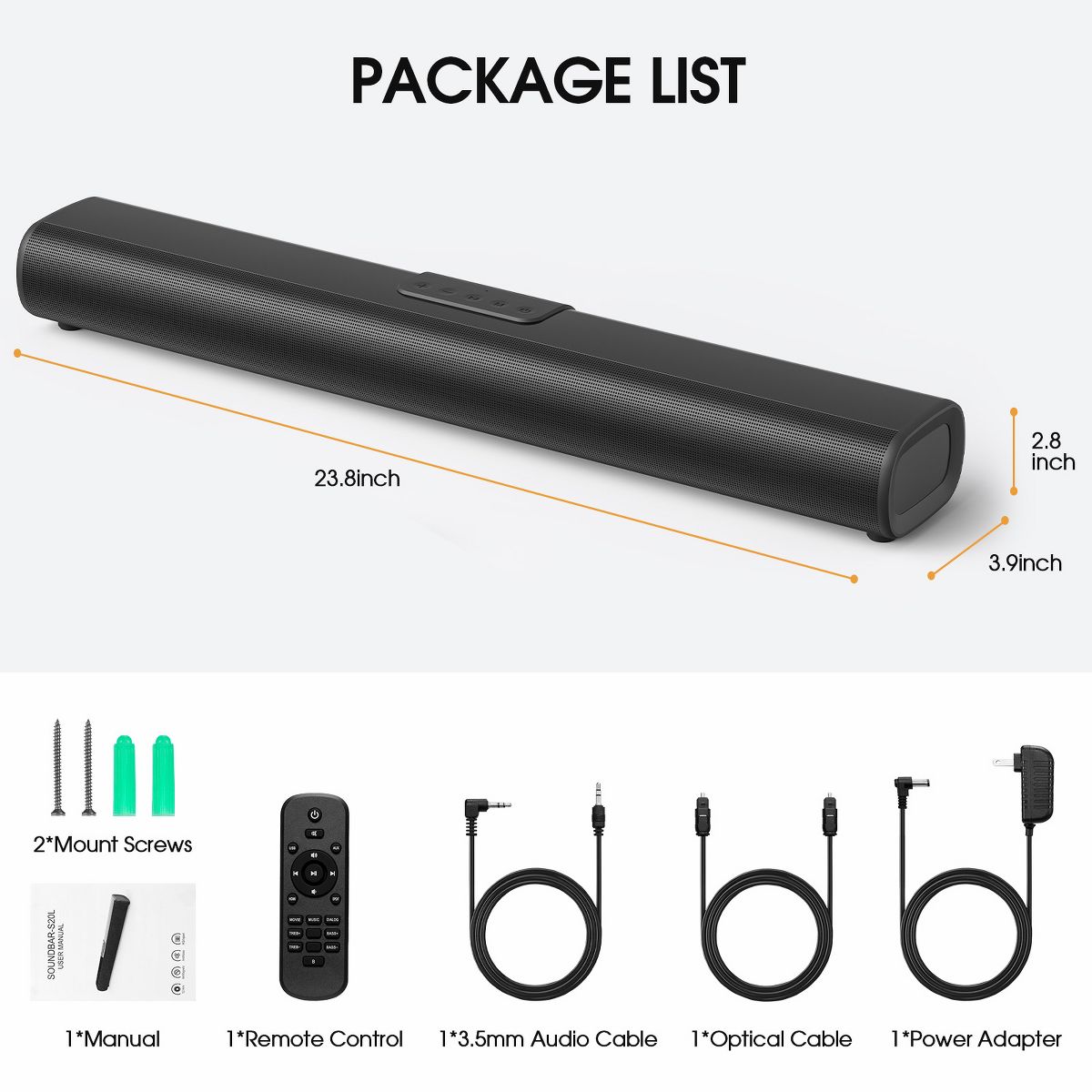 2.8 inches (H) x 23.8 inches (W) x 3.9 inches (D)