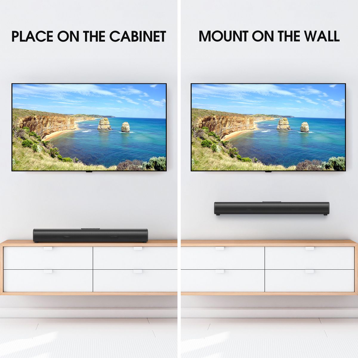 Slim 23.8" design fits easily under TVs or mounts on walls.