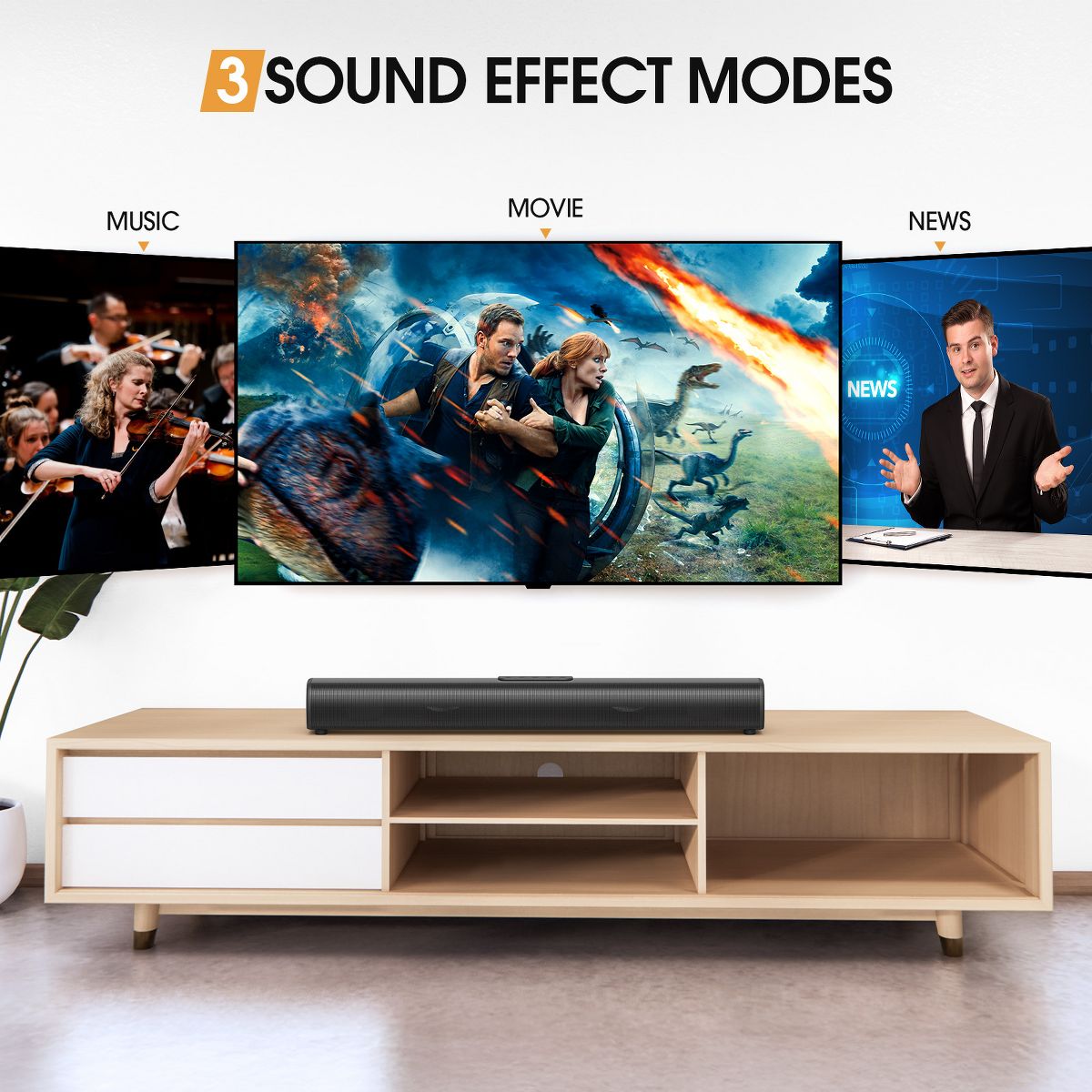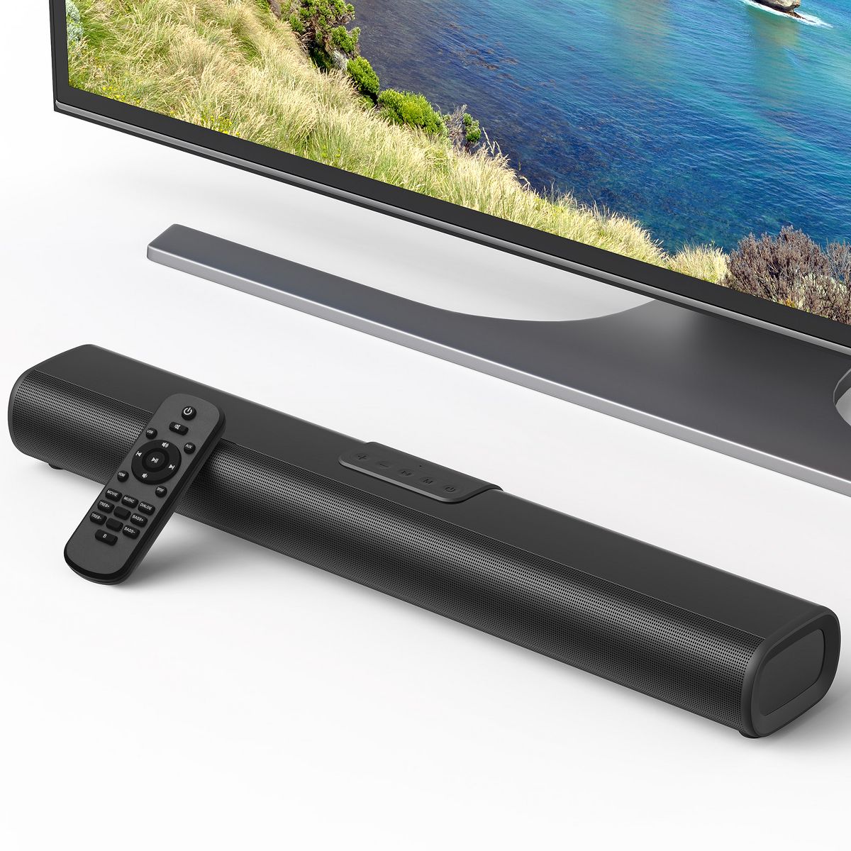 Upgrade your home entertainment with this 50W Bluetooth soundbar. Dual full-range drivers deliver clear highs, rich mids, and deep bass, while 3D surround technology creates a theater-like experience for movies, music, and gaming. With Bluetooth 5.0 and multiple wired inputs, it connects easily to TVs, laptops, or phones. Its slim 23.8" design fits any décor and can be wall-mounted or placed on a cabinet.