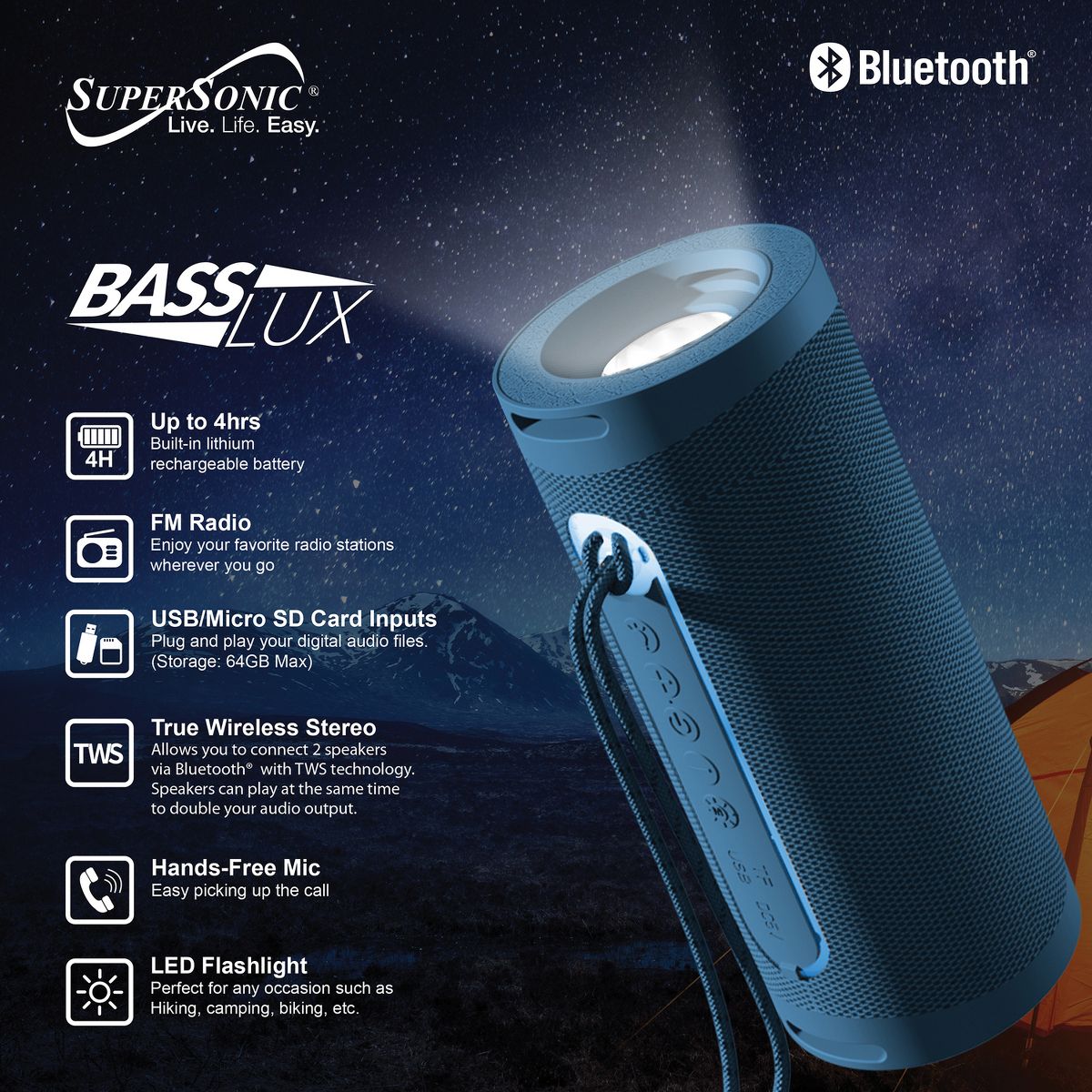 Supersonic® Portable Bluetooth® Speaker with LED Flashlight and Speakerphone, SC-2340BT (Blue)
