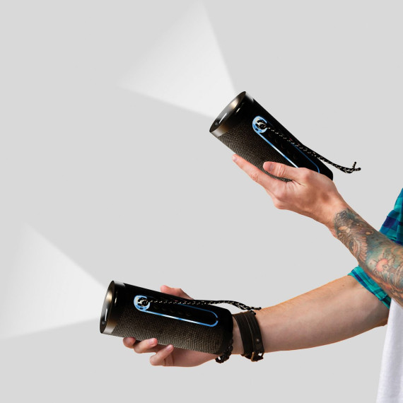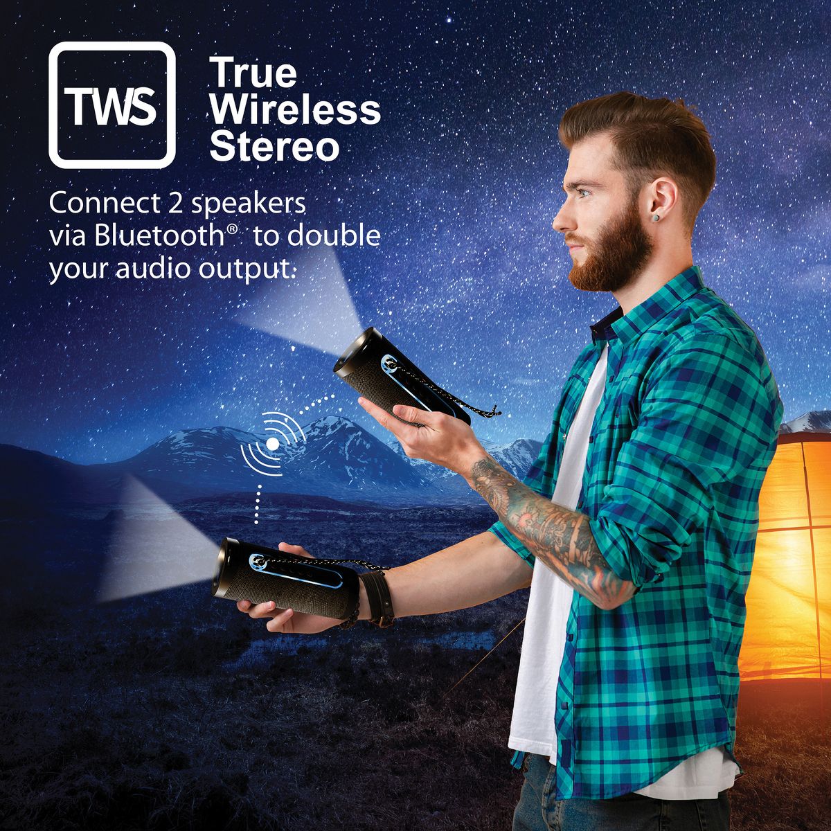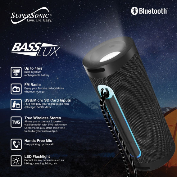 Take your music on the go with the Supersonic® SC-2340BT Portable Bluetooth® Speaker with Flashlight and Speakerphone. Experience rich stereo sound wirelessly with Bluetooth® 5.3 compatibility, allowing seamless connectivity with your favorite Bluetooth®-enabled devices. With its built-in microphone, the speaker lets you easily switch from enjoying your music to hands-free calling without missing a beat. FM radio, USB, and microSD™ Card compatibility offer additional playback options for your convenience. You can also explore the great outdoors with confidence thanks to the integrated LED flashlight, ideal for hiking, camping, biking, and more. The compact 2-in. speaker size of ensures portability without compromising on sound quality. And you’ll enjoy up to 4 hours of play time on a single charge, thanks to its built-in rechargeable battery. Elevate your adventures with the Supersonic® SC-2340BT and enjoy music and illumination in one compact package.