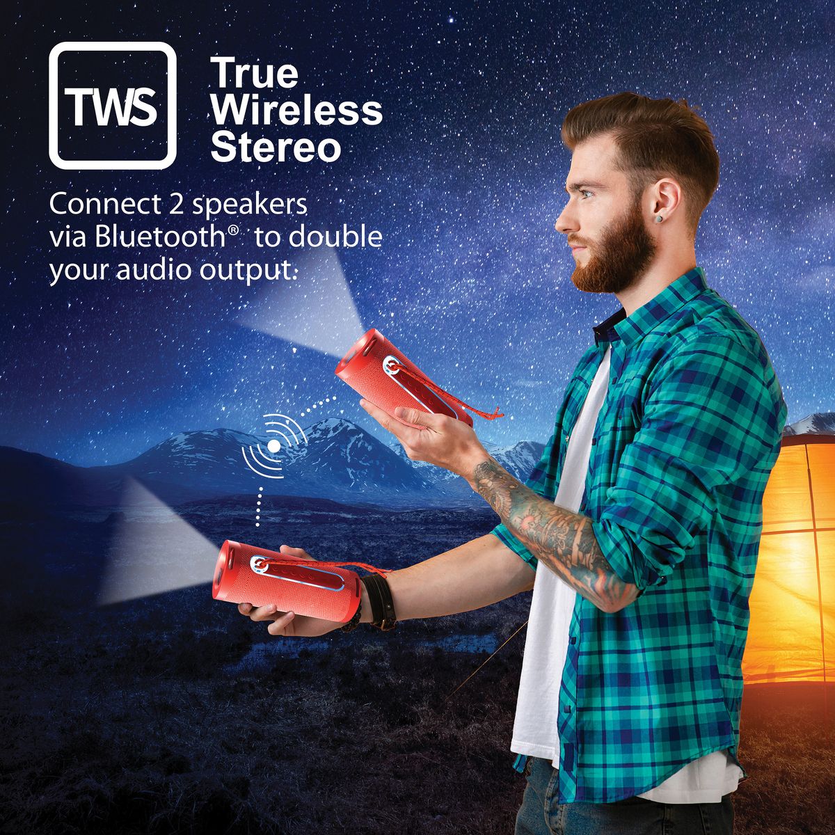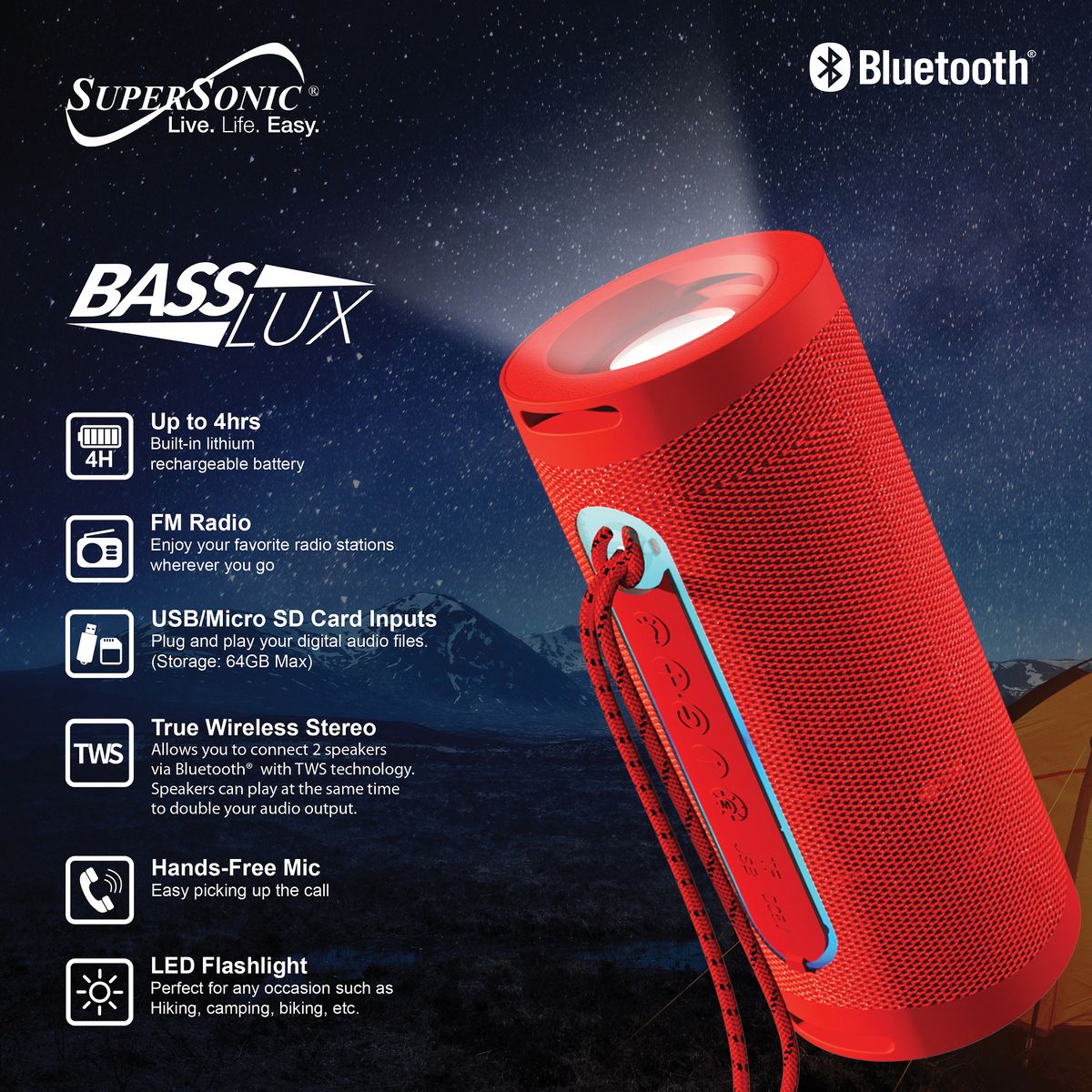 Take your music on the go with the Supersonic® SC-2340BT Portable Bluetooth® Speaker with Flashlight and Speakerphone. Experience rich stereo sound wirelessly with Bluetooth® 5.3 compatibility, allowing seamless connectivity with your favorite Bluetooth®-enabled devices. With its built-in microphone, the speaker lets you easily switch from enjoying your music to hands-free calling without missing a beat. FM radio, USB, and microSD™ Card compatibility offer additional playback options for your convenience. You can also explore the great outdoors with confidence thanks to the integrated LED flashlight, ideal for hiking, camping, biking, and more. The compact 2-in. speaker size of ensures portability without compromising on sound quality. And you’ll enjoy up to 4 hours of play time on a single charge, thanks to its built-in rechargeable battery. Elevate your adventures with the Supersonic® SC-2340BT and enjoy music and illumination in one compact package.