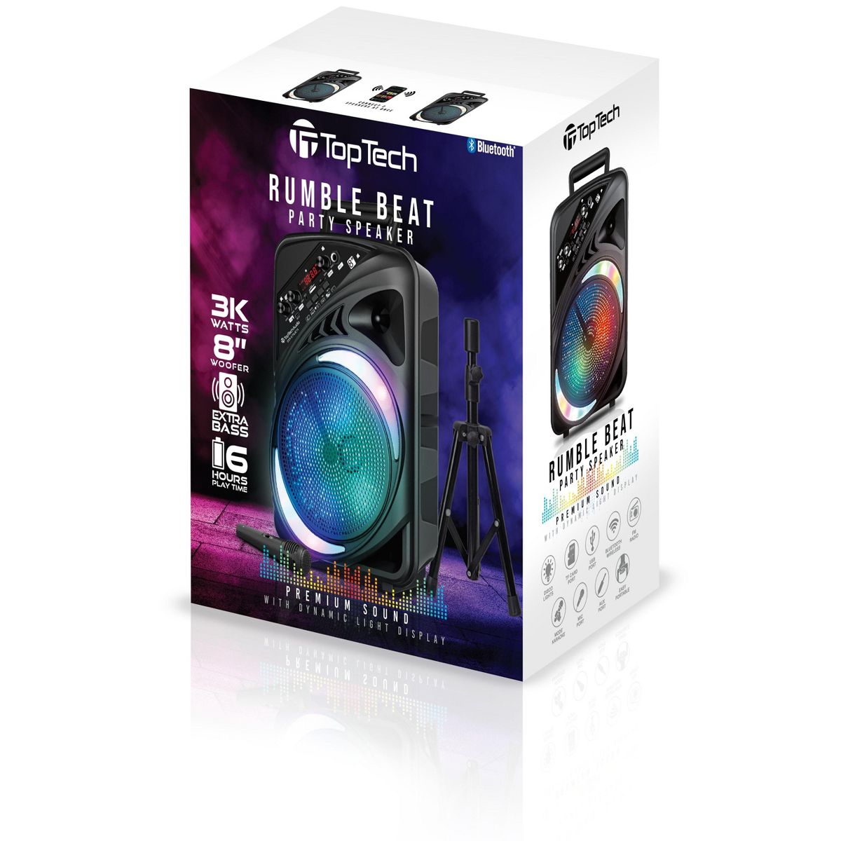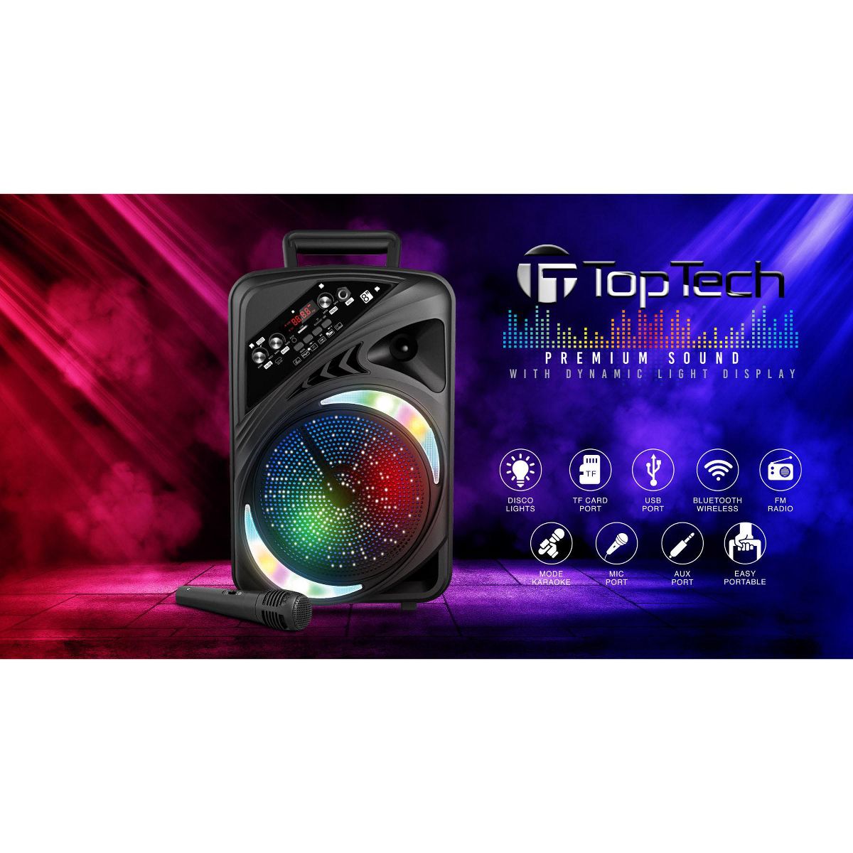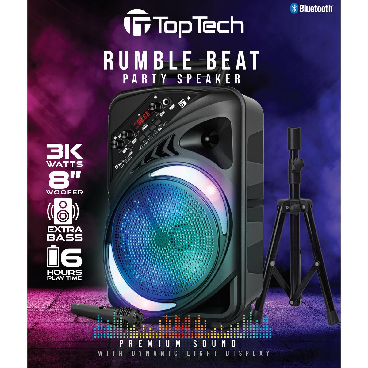 TOPTECH AL-8 8" Bluetooth Speaker, TWS Sound, Neon Light Show, Portable for Outdoors Black