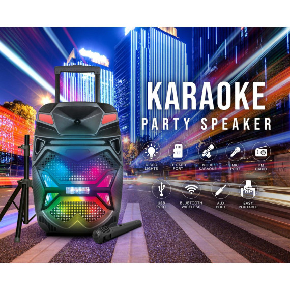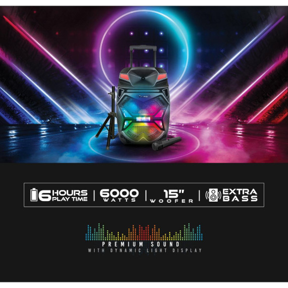 The TOPTECH BLADE-15 is a powerhouse for any event, offering powerful music power, stunning multi-color disco lights, and immersive sound with a 15'' woofer. Whether you're hosting an outdoor camping trip or a lively party, this portable speaker delivers vibrant audio and visual excitement. It features a built-in rechargeable battery for up to 6 hours of playtime, Bluetooth wireless connectivity, and an included wireless microphone for karaoke fun. With a sleek design and portability features like a stand, it's perfect for both indoor and outdoor use.