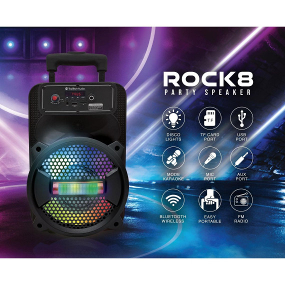 The TOPTECH Rock-8 comes with dazzling disco lights that sync with the music, creating a fun and lively atmosphere for parties or gatherings. The lights enhance the party vibe, making your event more exciting and visually engaging. Whether indoors or outdoors, these lights add an extra dimension to your music experience.