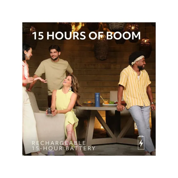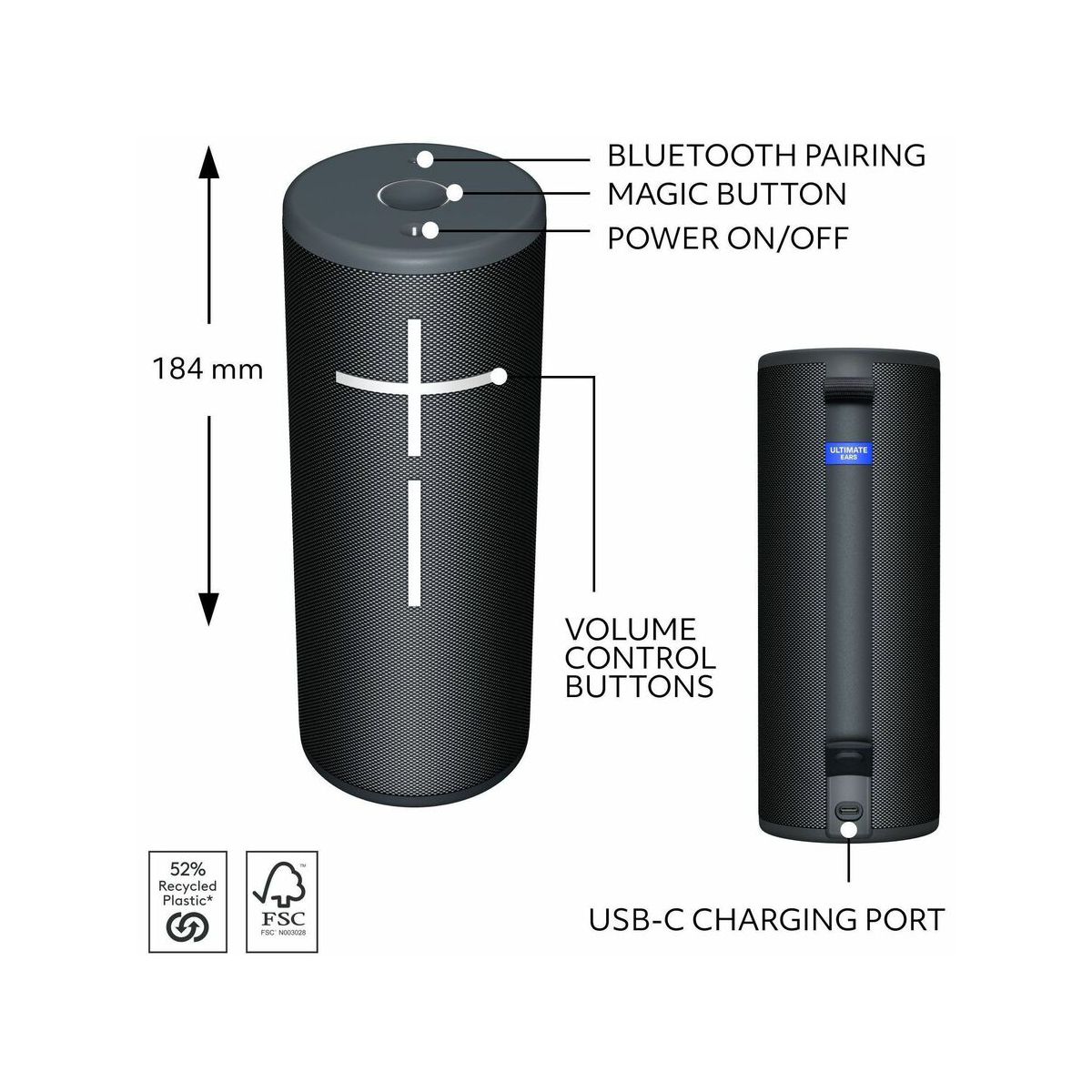 BOLD SOUND BOLDY PORTABLEBOOM 4 packs a sonic punch for its size. Featuring Ultimate Ears unique audio processing, it produces clear and balanced audio faithful to the music you love, and at every volume level.VIRTUALLY INDESTRUCTIBLEBOOM 4 was born to hit the road. From rooftop-raging to mountaintop-shredding, BOOM 4's got your back. It's IP67 rated, waterproof, floatable and drop-proof. Take it anywhere. It's more powerful than you expect.15-HOUR BATTERY LIFEBOOM 4 gives you 15 hours of sonic power on a single charge.This portable speaker has long battery life that keeps the party going.CONNECT AND PARTYUPUse PartyUp on the UE | BOOM App to pair 1, 2 , 3... and over 150 speakers and create the ultimate sound experience. You can combine multiple BOOM 4, MEGABOOM 4, EVERBOOM, EPICBOOM and HYPERBOOM speakers or even pair them with previous generation BOOM speakers. Build a wall of sound? No problem.MAGIC BUTTON ONE-TAP CONTROLOne tap to dive in. Play, pause, and skip tracks directly from your BOOM 4. Set up one-touch playlists on your favorite streaming platforms like Spotify, Amazon Music on Android,and Apple Music for iOS by UE | BOOM App.MADE WITH RECYCLED PLASTICPlastic parts in BOOM 4 include a minimum of 52% certified post-consumer recycled plastic by weight. It's also designed for recycling.