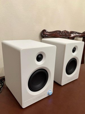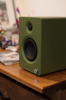 Victrola Tempo Bookshelf Speakers deliver powerful, room-filling sound providing an immersive listening experience for music lovers and vinyl enthusiasts alike. Featuring Bluetooth streaming and Auracast™ multi-speaker connectivity, the Tempo speakers allow you to wirelessly expand your setup across multiple speakers for a seamless audio experience with enhanced range and stability. Designed for versatility, they offer multiple wired inputs, including RCA, 3.5mm AUX, Optical, and USB-C, making them perfect for pairing with turntables, TVs, computers, and mobile devices. The front-facing illuminated control knob offers quick, easy access to volume and source selection, keeping your controls intuitive and within reach. A built-in subwoofer output with a bass filter switch ensures optimized low-end performance when connecting an external subwoofer, giving you the flexibility to expand your sound system further. Crafted with a sleek, modern design to complement Victrola’s turntable lines, the Tempo speakers blend premium audio quality with stylish aesthetics, making them a perfect addition to any home audio setup. Whether you’re spinning vinyl or streaming playlists, the Tempo speakers deliver outstanding sound and timeless design.
