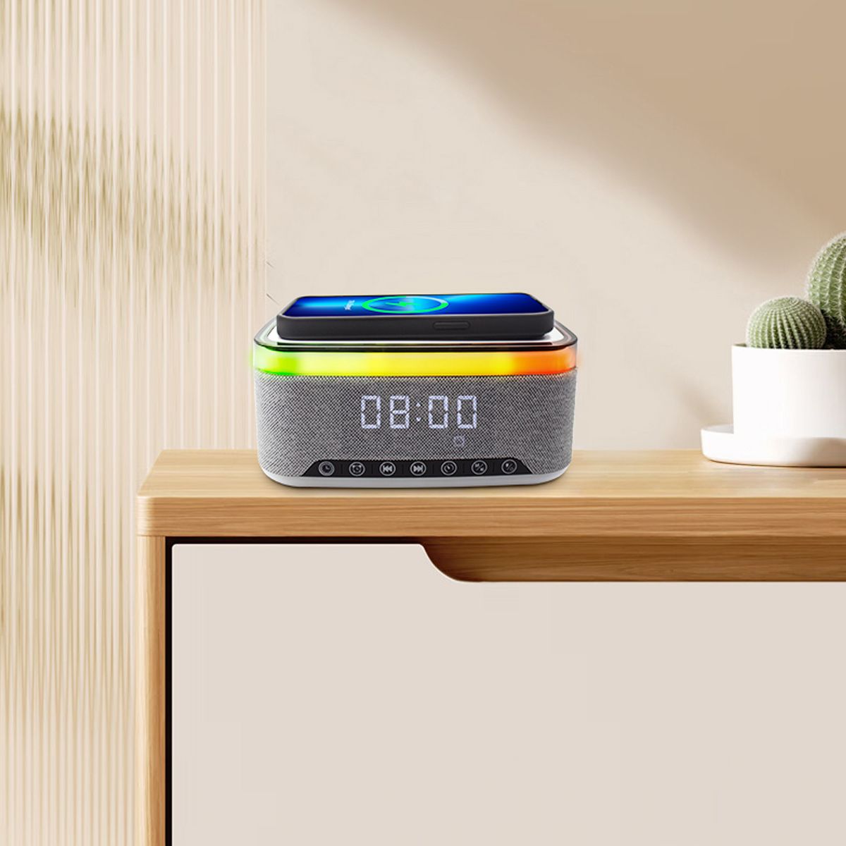 Elevate your daily routine with the ultimate multifunctional device: a sleek White Noise Bluetooth Speaker that combines a wireless charger and alarm clock for a seamless lifestyle. This all-in-one gadget offers crystal-clear sound, soothing white noise, and convenient charging—all while keeping you on schedule. Perfect for your bedside table, office desk, or anywhere you need smart functionality.