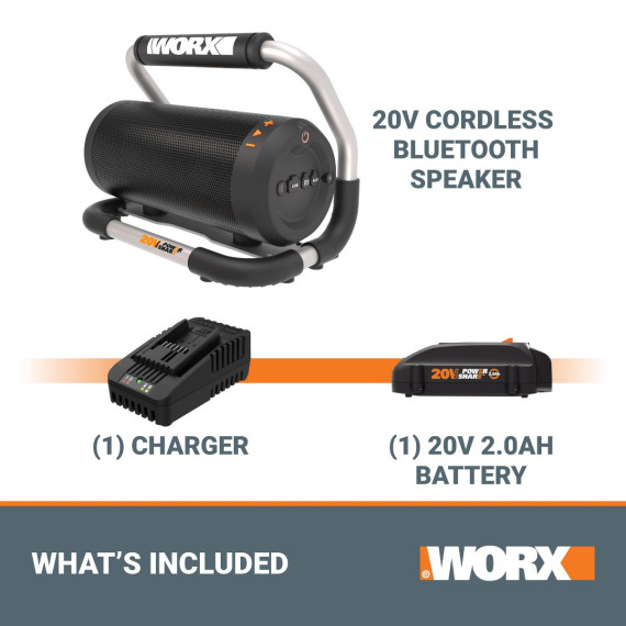 The WORX 20V Power Share® Cordless Bluetooth Speaker is the ideal solution for bringing sound to your space. Whether you're at work, in the garage, at a job site, hosting a party, or taking a beach trip, this fully portable Bluetooth speaker is ready to level up your listening experience. Built with a powerful loudspeaker, the device can produce up to 90 dB for smooth, clear audio. And thanks to Power Share® battery, it can deliver up to 10 hours of listening (with the 2Ah 20V battery) without ever having to be plugged in - a truly convenient way to take music on the move. It's also equipped with a padded roll cage that protects the speaker from unexpected bumps and serves as an easy-carry handle. The cage features a flat base to support the speaker on any flat surface. Using Bluetooth capability, the speaker can connect with any mobile device at a range of up to 32 feet. You can also enjoy added flexibility with the aux input that connects directly with any device using an aux cable. A convenient USB charging port also makes it easy to keep smartphones and other small devices fully charged while you play music. Operating the speaker is a breeze - just use the intuitive buttons to control the power, Bluetooth connectivity, and volume. No fuss. All sound.