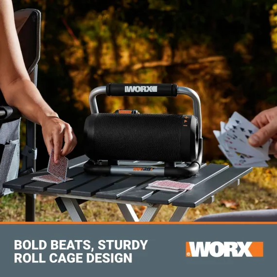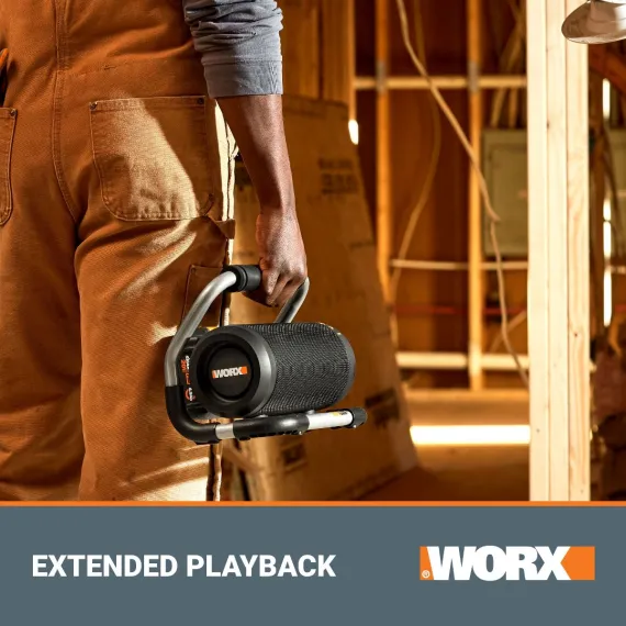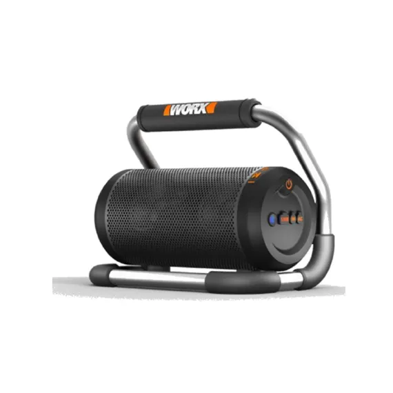 The WORX 20V Power Share® Cordless Bluetooth Speaker is the ideal solution for bringing sound to your space. Whether you're at work, in the garage, at a job site, hosting a party, or taking a beach trip, this fully portable Bluetooth speaker is ready to level up your listening experience. Built with a powerful loudspeaker, the device can produce up to 90 dB for smooth, clear audio. And thanks to Power Share® battery, it can deliver up to 10 hours of listening (with the 2Ah 20V battery) without ever having to be plugged in - a truly convenient way to take music on the move. It's also equipped with a padded roll cage that protects the speaker from unexpected bumps and serves as an easy-carry handle. The cage features a flat base to support the speaker on any flat surface. Using Bluetooth capability, the speaker can connect with any mobile device at a range of up to 32 feet. You can also enjoy added flexibility with the aux input that connects directly with any device using an aux cable. A convenient USB charging port also makes it easy to keep smartphones and other small devices fully charged while you play music. Operating the speaker is a breeze - just use the intuitive buttons to control the power, Bluetooth connectivity, and volume. No fuss. All sound.