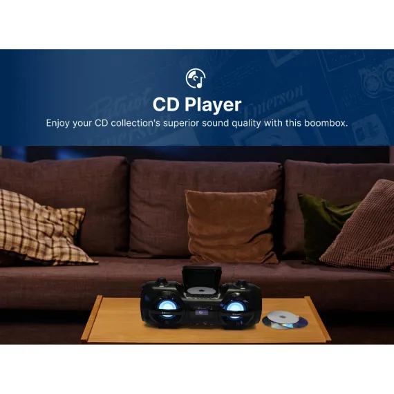 Introducing our versatile Top-load CD Player with Bluetooth® Wireless Technology, the ultimate all-in-one entertainment solution. Seamlessly combining classic CD playback with modern connectivity options, this device caters to all your music needs. Enjoy the nostalgic charm of CD, CD-R, and CD-RW formats with our top-load CD player, featuring intuitive play/pause, skip/search, and repeat functions. With a capacity for up to 20 CD tracks and programmable memory, create custom playlists for uninterrupted enjoyment. Embrace the convenience of wireless streaming with built-in Bluetooth® technology, effortlessly pairing your devices for high-quality audio playback. With a rechargeable battery ensuring the fun never stops, take your music with you wherever you go, indoors or out. Stay connected to the airwaves with integrated AM/FM radio featuring a telescopic antenna for clear stereo reception. Additionally, the Aux-in jack provides versatility for connecting external devices, while dynamic high-performance speakers deliver rich, immersive sound. Complete with an LED digital display for easy track navigation and a telescopic antenna for enhanced radio reception, our Top-load CD Player with Bluetooth® Wireless Technology redefines convenience and versatility in music entertainment. Elevate your listening experience today and enjoy your favorite tunes in any format, anywhere.