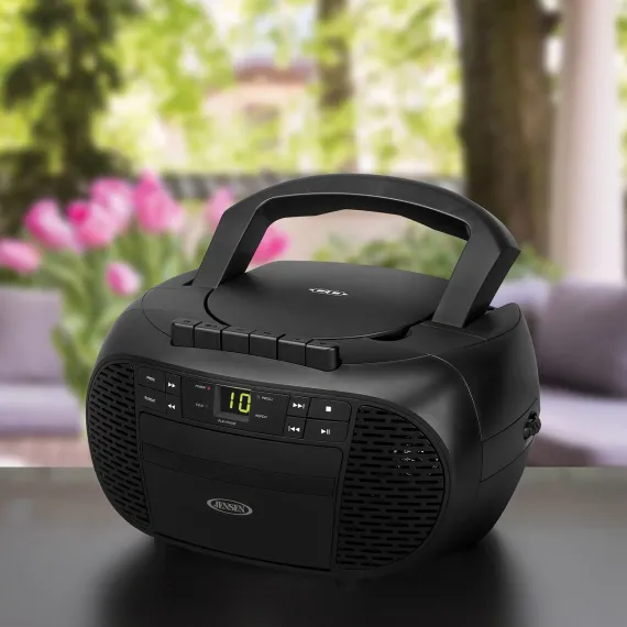 The CD-550ABT Portable Bluetooth® Stereo Compact Disc Cassette Recorder with AM/FM Radio from JENSEN® lets you take along your favorite tunes with a feature-rich music system that includes a CD player, cassette recorder, AM/FM stereo radio, and Bluetooth® connectivity. This unit features a top-loading CD player with green LED track display, which is compatible with both CD-R and CD-RW compact discs, so it provides versatile playback options for store-bought or custom-made CDs. This portable stereo music system has a built-in handle, which is smooth and comfortable for easy transport. Enjoy making recordings with a simple 1-touch function or use the built-in antenna to get clear AM/FM radio for listening or recording. A stereo headphone jack and aux input jack for connecting your iPod®, MP3, or other digital audio players provide even more functionality. This device uses standard 120-volt/60-Hz power or can operate on 6 C batteries (sold separately).