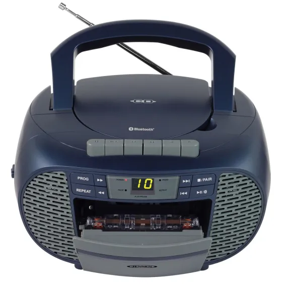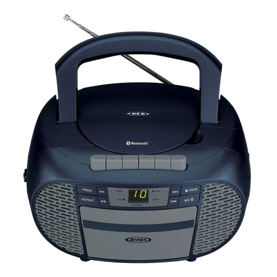 The CD-550ABT Portable Bluetooth® Stereo Compact Disc Cassette Recorder with AM/FM Radio from JENSEN® lets you take along your favorite tunes with a feature-rich music system that includes a CD player, cassette recorder, AM/FM stereo radio, and Bluetooth® connectivity. This unit features a top-loading CD player with green LED track display, which is compatible with both CD-R and CD-RW compact discs, so it provides versatile playback options for store-bought or custom-made CDs. This portable stereo music system has a built-in handle, which is smooth and comfortable for easy transport. Enjoy making recordings with a simple 1-touch function or use the built-in antenna to get clear AM/FM radio for listening or recording. A stereo headphone jack and aux input jack for connecting your iPod®, MP3, or other digital audio players provide even more functionality. This device uses standard 120-volt/60-Hz power or can operate on 6 C batteries (sold separately).