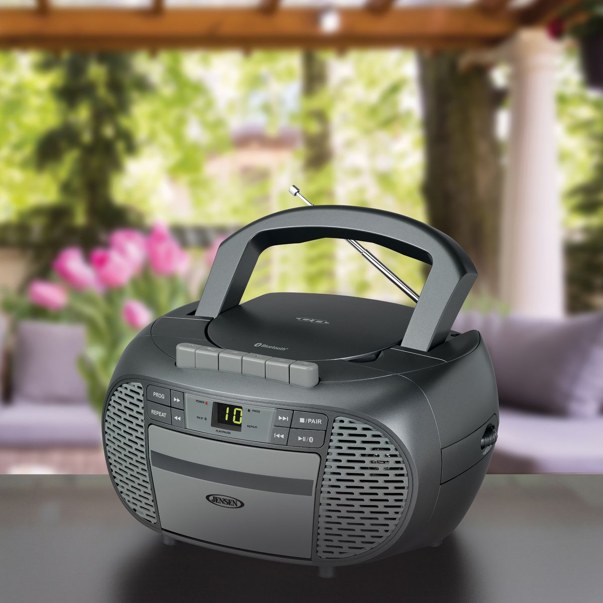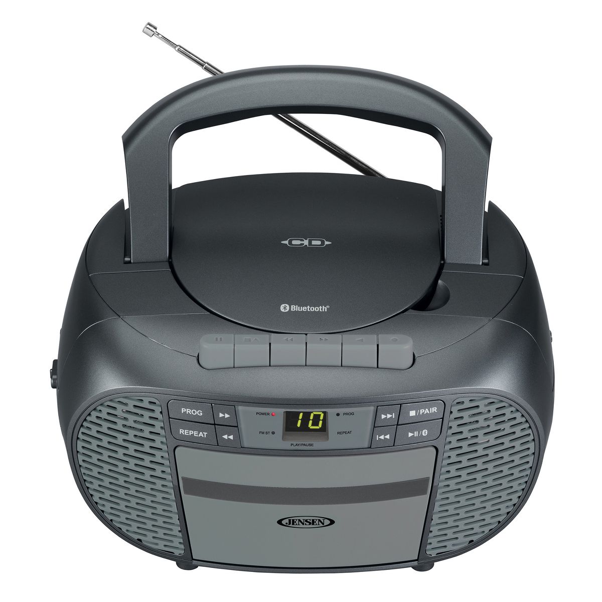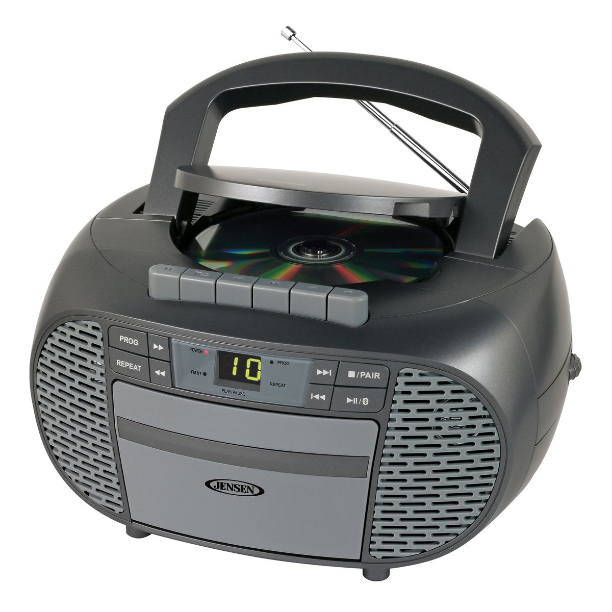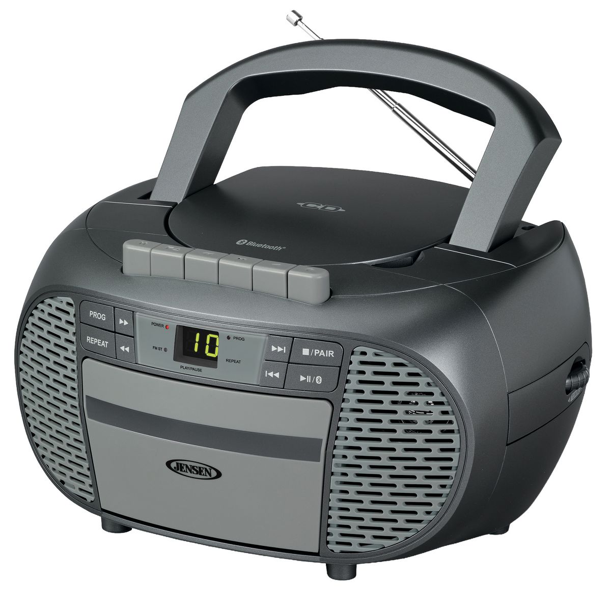 The CD-550ABT Portable Bluetooth® Stereo Compact Disc Cassette Recorder with AM/FM Radio from JENSEN® lets you take along your favorite tunes with a feature-rich music system that includes a CD player, cassette recorder, AM/FM stereo radio, and Bluetooth® connectivity. This unit features a top-loading CD player with green LED track display, which is compatible with both CD-R and CD-RW compact discs, so it provides versatile playback options for store-bought or custom-made CDs. This portable stereo music system has a built-in handle, which is smooth and comfortable for easy transport. Enjoy making recordings with a simple 1-touch function or use the built-in antenna to get clear AM/FM radio for listening or recording. A stereo headphone jack and aux input jack for connecting your iPod®, MP3, or other digital audio players provide even more functionality. This device uses standard 120-volt/60-Hz power or can operate on 6 C batteries (sold separately).