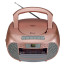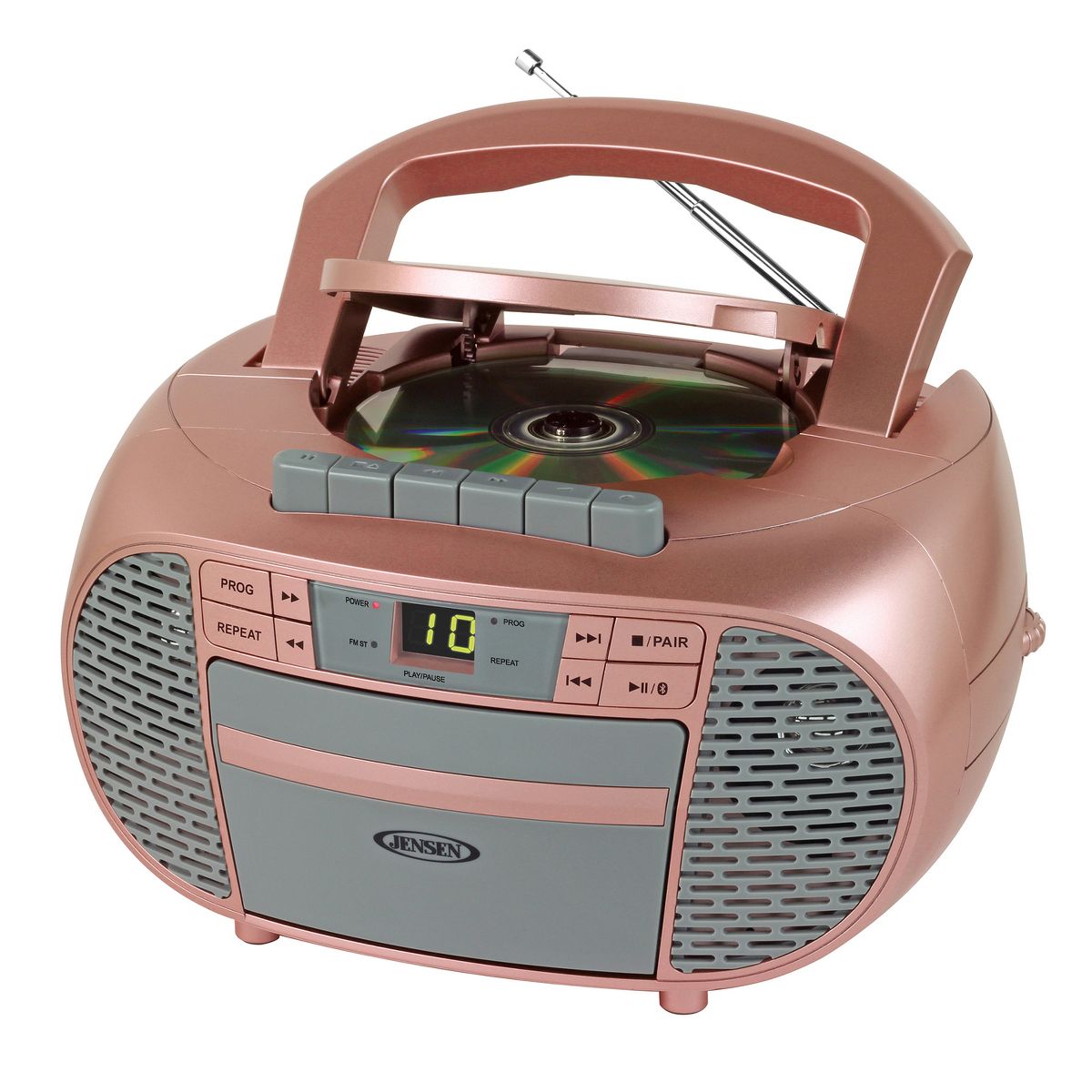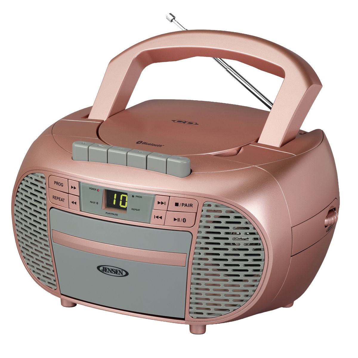The CD-550ABT Portable Bluetooth® Stereo Compact Disc Cassette Recorder with AM/FM Radio from JENSEN® lets you take along your favorite tunes with a feature-rich music system that includes a CD player, cassette recorder, AM/FM stereo radio, and Bluetooth® connectivity. This unit features a top-loading CD player with green LED track display, which is compatible with both CD-R and CD-RW compact discs, so it provides versatile playback options for store-bought or custom-made CDs. This portable stereo music system has a built-in handle, which is smooth and comfortable for easy transport. Enjoy making recordings with a simple 1-touch function or use the built-in antenna to get clear AM/FM radio for listening or recording. A stereo headphone jack and aux input jack for connecting your iPod®, MP3, or other digital audio players provide even more functionality. This device uses standard 120-volt/60-Hz power or can operate on 6 C batteries (sold separately).