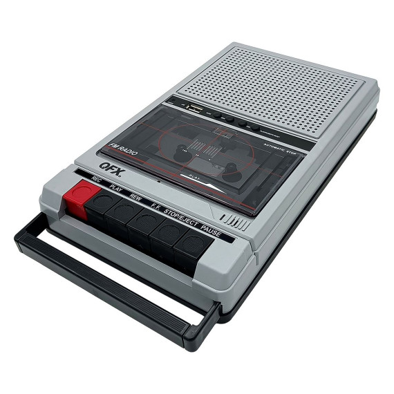The QFX Retro-40 is a Bluetooth®-enabled cassette tape recorder housed in a vintage shoebox enclosure design. Record to cassette tapes from line level sources (CD, radio, etc.) or create voice memo recordings using its built-in microphone. Retro-40 brings modern conveniences for wireless music listening through its ability to pair to Bluetooth®-enabled devices. You can also play music files stored on USB drives and even create custom music mix cassette tapes from music stored on and played from the USB drive. The Retro-40 also travels well since it can be powered using either its AC adapter or from 4 C batteries (not included).