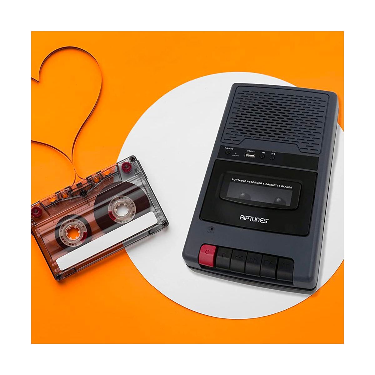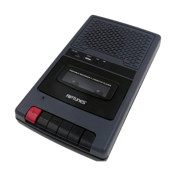 Experience quality music from the Riptunes Shoebox-style Cassette Player/Recorder. Directly play your music from a USB flash drive or convert your favorite music from cassette to digital MP3. This unit is compact and portable so its easy to pack and take on the go. It has a 3.5mm headphone jack, speaker and retractable carry handle. Use the built-in microphone for custom recording or plug into the Mic port.