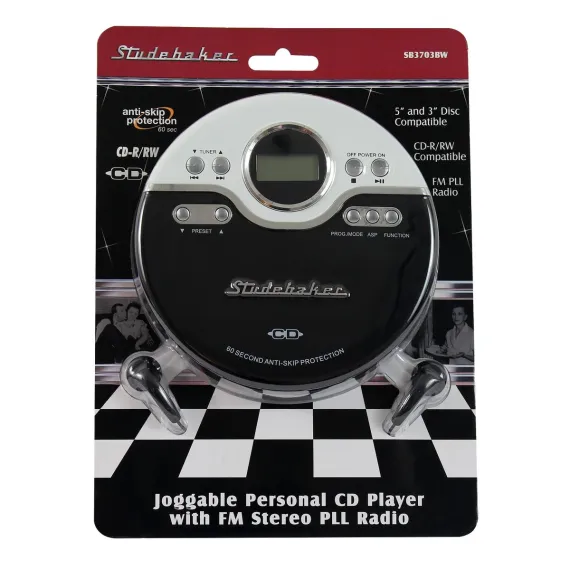 Studebaker Personal CD Player with FM Radio, 60 Second ASP and Earbuds (SB3703) - Black