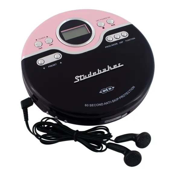Listen to your favorite tracks on the go with the Studebaker SB3703 personal CD player with FM radio. This compact, lightweight device comes in 3 colors. The CD player includes a headphone jack and earbuds. It features 60-second Anti-Skip protection, bass boost, digital LCD display, Skip/Search, Play/Pause, Repeat, and programmable memory. This player has a mini USB port so the unit can be powered through a computer or any other USB power source. Requires two (2) AA batteries for power (not included) for portable use.