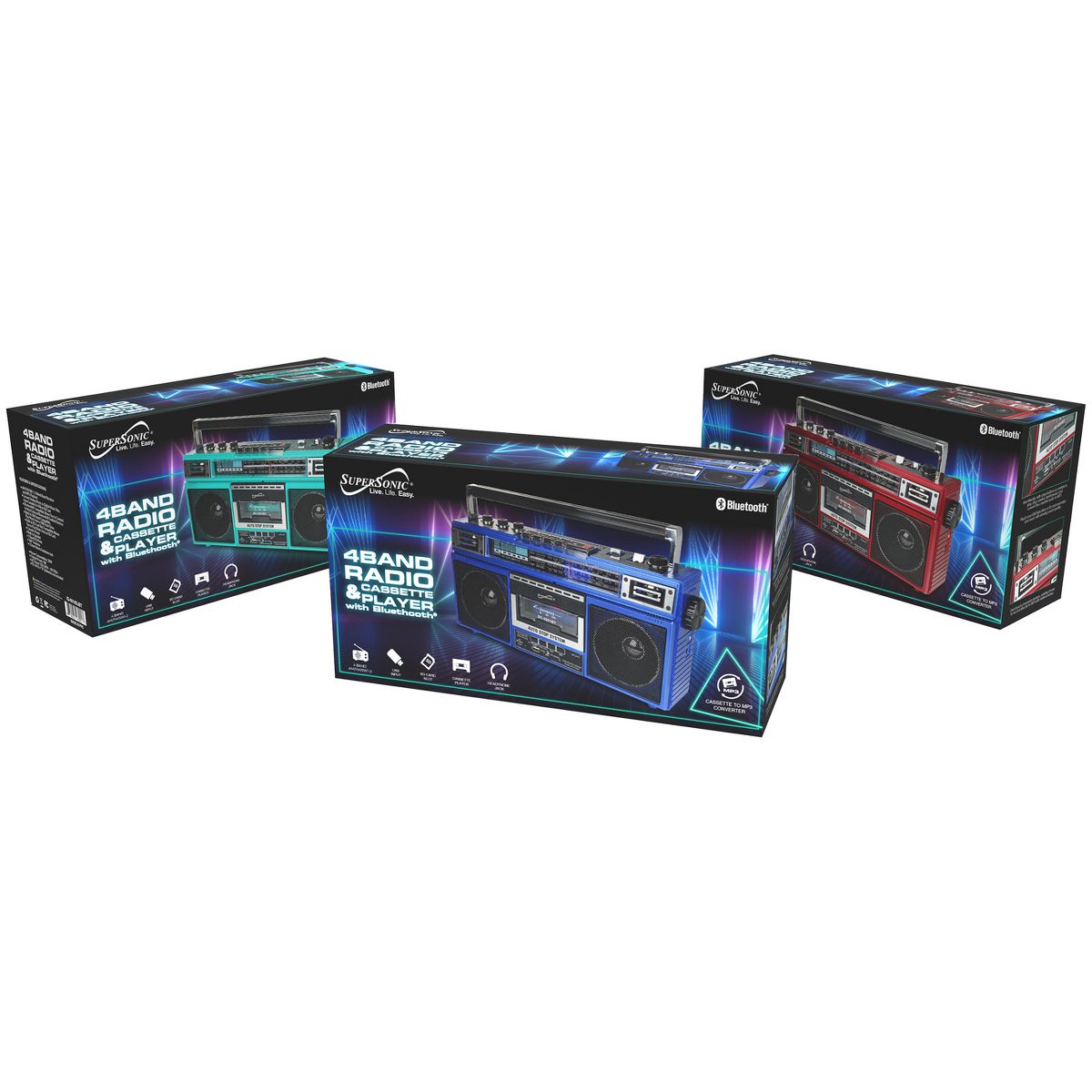 Elevate your music experience with the Supersonic® AM/FM/SW World-Band Receiver Boom Box, striking the ideal balance between nostalgia and modern functionality. This boom box appeals to kids and adults alike, thanks to its cassette player for a trip down memory lane and its compatibility with USB, SD™ Cards, and Bluetooth® for contemporary music streaming. Whether you're grooving to your favorite 80s hits or exploring the latest tracks, this boom box offers a 360° antenna for crystal clear radio reception and a 3-band EQ mode for a tailored audio experience. The boom box also offers the ability to convert cherished analog music into digital files, making it a breeze to relive your favorite tunes from cassette tapes on your own USB or SD™ Cards. With both a built-in speaker and a 3.5-mm stereo earphone jack, you can enjoy music your way, while its versatile power options, from AC to DC, make it suitable for any setting. Embrace the best of both worlds with this boom box that harmoniously blends old-school charm with cutting-edge technology.