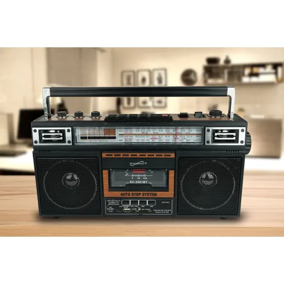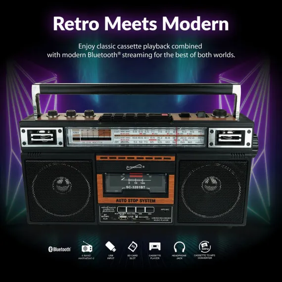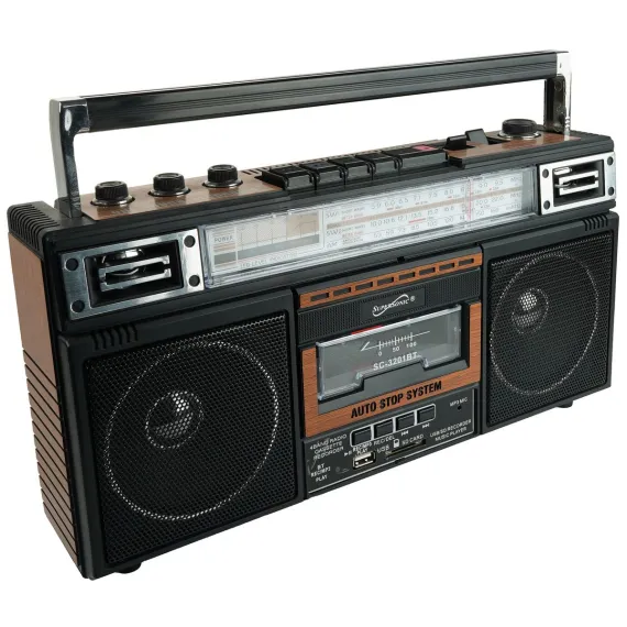 Elevate your music experience with the Supersonic® AM/FM/SW World-Band Receiver Boom Box, striking the ideal balance between nostalgia and modern functionality. This boom box appeals to kids and adults alike, thanks to its cassette player for a trip down memory lane and its compatibility with USB, SD™ Cards, and Bluetooth® for contemporary music streaming. Whether you're grooving to your favorite 80s hits or exploring the latest tracks, this boom box offers a 360° antenna for crystal clear radio reception and a 3-band EQ mode for a tailored audio experience. The boom box also offers the ability to convert cherished analog music into digital files, making it a breeze to relive your favorite tunes from cassette tapes on your own USB or SD™ Cards. With both a built-in speaker and a 3.5-mm stereo earphone jack, you can enjoy music your way, while its versatile power options, from AC to DC, make it suitable for any setting. Embrace the best of both worlds with this boom box that harmoniously blends old-school charm with cutting-edge technology.