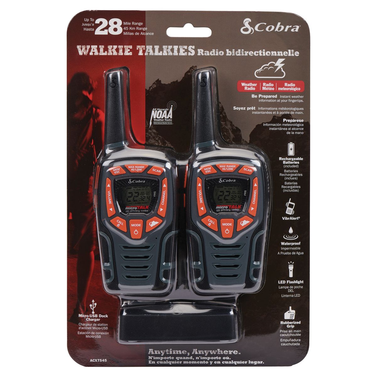 The Cobra ACXT545 is a rugged, weather-resistant 2-way radio/walkie talkie with additional features for recreational or business use. With up to 28-mile range, water-resistant (IPX2) rating, NOAA weather alerts, VibrAlert feedback for incoming transmissions, built-in LED flashlight, and more, this 2-pack of ACXT545 walkie talkies are ideal for clear communication and emergency preparedness.