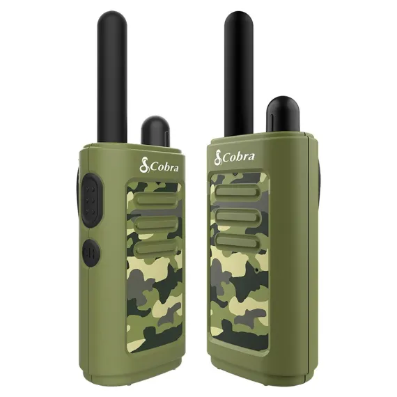 Great for families and kids! The ergonomically designed Cobra HE150 Kid's Hero 16-Mile Range Walkie Talkies in Blue are an affordable and compact option for active families. This pair of walkie talkies in camo design has up to a 16-mile range, 2 channels, call alert, and battery/power saver. You'll be able to have clear conversations inside or outdoors.