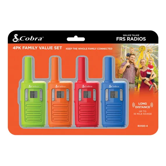 Join the Cobra® Nation and experience the power of reliable communication with the Cobra® RX100 4-Pack Walkie Talkie set. Designed for families and friends to use outdoors, these handheld 2-way radios offer an impressive range up to 16 miles and easy access to 22 FRS (Family Radio Service) channels. Whether on a camping trip, hiking trail, or just your neighborhood, these Cobra® walkie talkies provide clear, dependable communication you can trust. Be ready for any weather with NOAA® weather alerts offering real-time updates to keep you informed and safe. The user-friendly design ensures effortless operation for all ages, making them ideal for kids and adults alike. Automatic Channel Scan, Call Alerts, and the Roger Beep Tone feature add convenience and clarity to every conversation. Compact and lightweight, each Cobra® RX100 handheld radio is powered by 3 AAA batteries (not included), making them easy to carry and travel-friendly. Durable, intuitive, and packed with features, the RX100 walkie talkie 4-pack is your family’s ultimate communication companion for any adventure. Choose Cobra® for reliable performance and peace of mind.