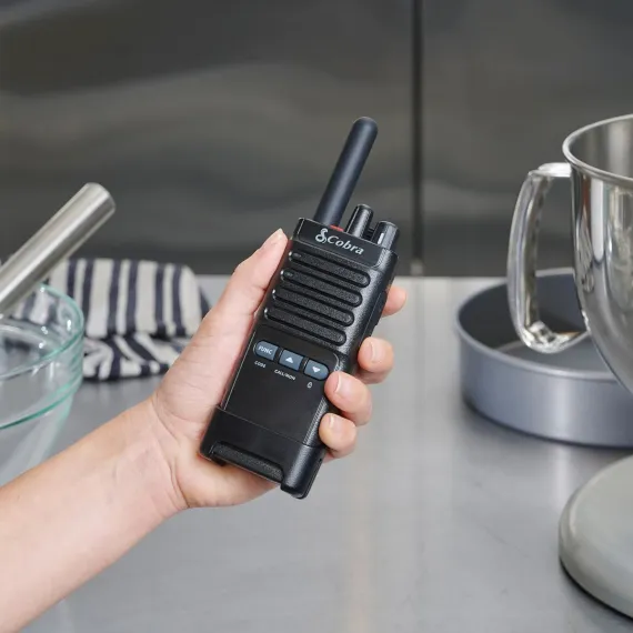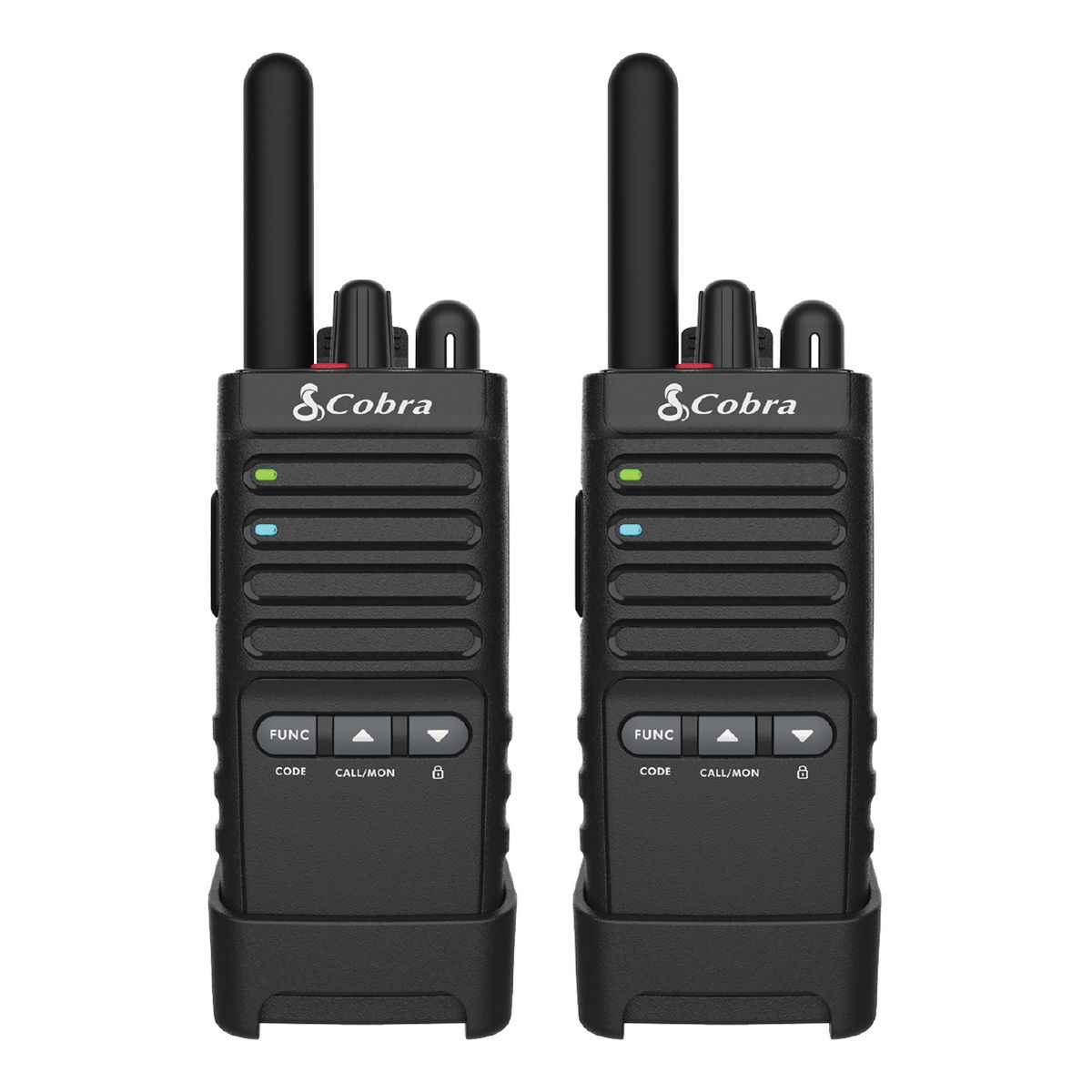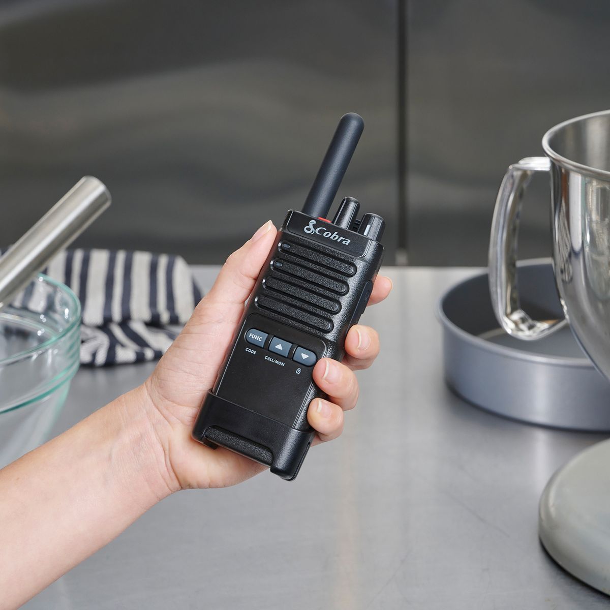 The Cobra PX650 Pro Business 2-way radios are ideal for larger businesses and have a range up to 300,000 sq. ft./25 floors. With the front push-to-talk button, dedicated channel and volume/power knobs, waterproof (IPX4) rating, and 180° swivel holster, you'll always have clear and reliable communication. Use this 6-pack of walkie talkies for retail, restaurants, events, warehouses and more.