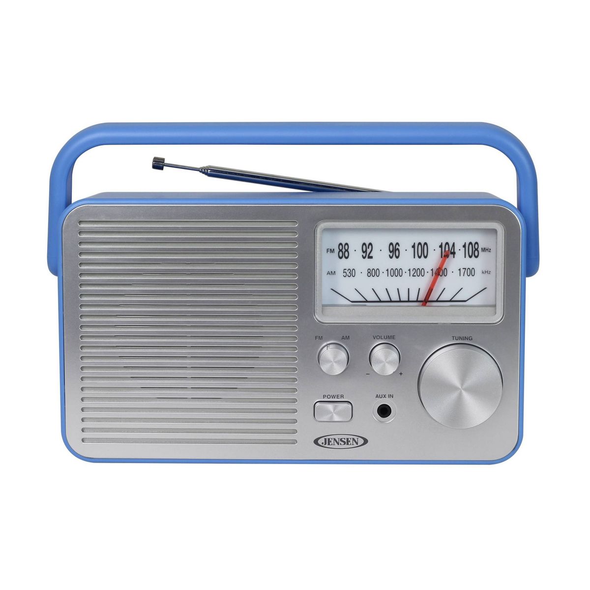 Never miss your favorite game, listening to your favorite radio station or catch up on the latest news with the JENSEN® MR-750 portable AM/FM radio. The radio can go anywhere you go and is available in three stylish colors with a large analog tuning dial that makes setting your favorite station a breeze. You can also play music from an MP3 or other digital media player using the front mounted auxiliary input jack. The MR-750 also includes a built-in speaker, folding handle and FM telescopic antenna. The unit operates on 120V AC power or using four (4) x "C" batteries (Not included).