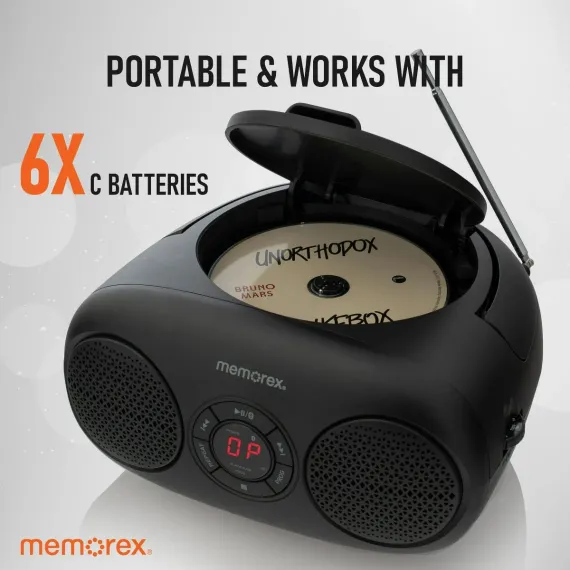 The MX-BCD30K is a top-loading CD player with Bluetooth playback, offering seamless wireless connectivity for your music. Compatible with CD-R/RW discs, it features a red LED CD track display for easy navigation. Enjoy convenient functions like skip/search, forward and back, and repeat (1 or all), along with programmable memory for a personalized listening experience. The built-in AM/FM stereo receiver and telescopic antennas ensure clear radio reception. Designed for portability, it includes a foldable carrying handle and an auxiliary input jack for additional audio sources. The MX-BCD30K also comes with a built-in AC adaptor for easy power access.