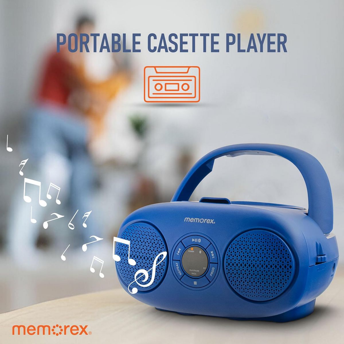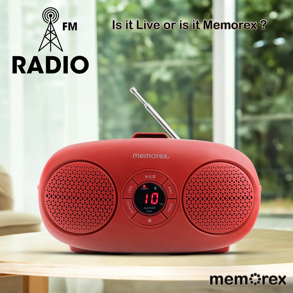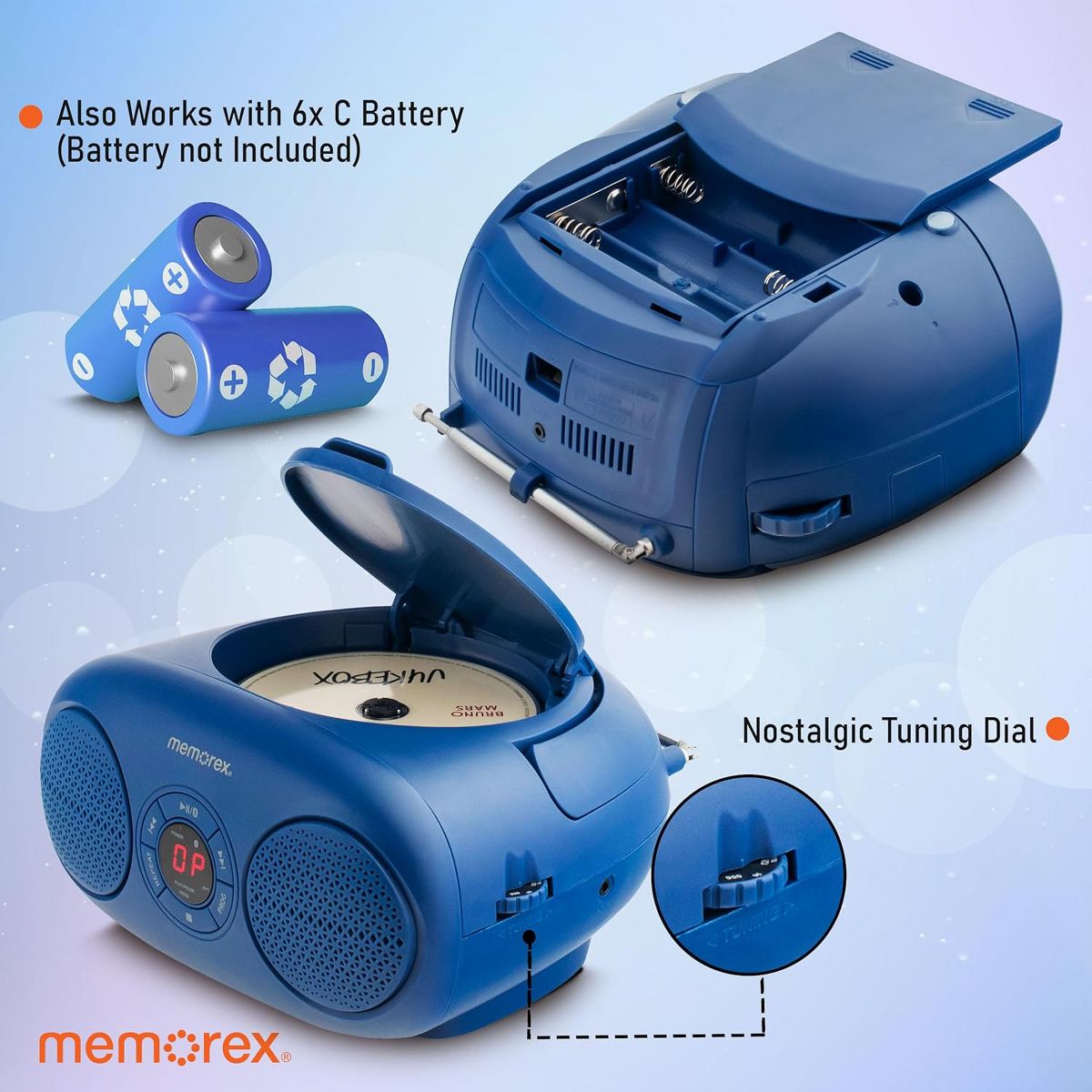 The MX-BCD30K is a top-loading CD player with Bluetooth playback, offering seamless wireless connectivity for your music. Compatible with CD-R/RW discs, it features a red LED CD track display for easy navigation. Enjoy convenient functions like skip/search, forward and back, and repeat (1 or all), along with programmable memory for a personalized listening experience. The built-in AM/FM stereo receiver and telescopic antennas ensure clear radio reception. Designed for portability, it includes a foldable carrying handle and an auxiliary input jack for additional audio sources. The MX-BCD30K also comes with a built-in AC adaptor for easy power access.