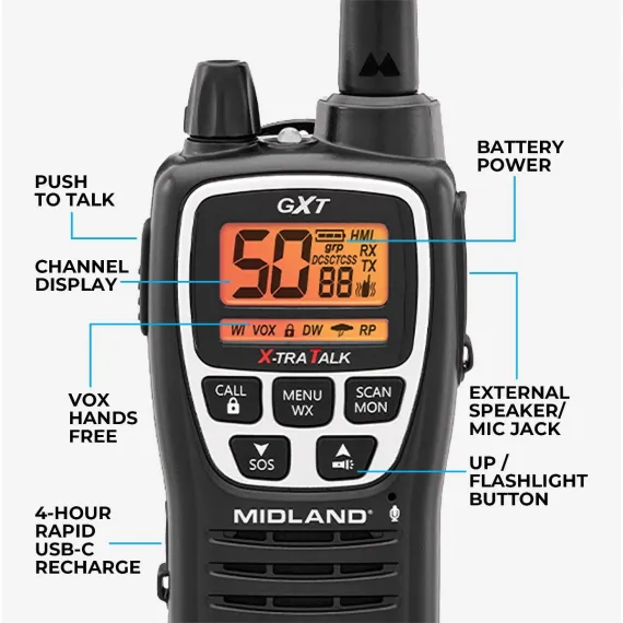 Midland’s new GXT3000 walkie talkies bring long-lasting battery life and repeater capability at a price that won’t break your bank, making it your go-to handheld radio on the farm, on the trail, or on the move.