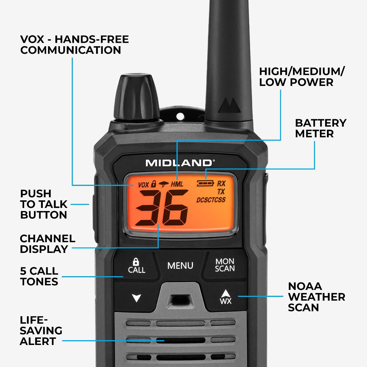 The X-Talker® T290 GMRS Two-Way Radio is the perfect solution for reliable communication on your next adventure. Whether you are hiking, camping, rock climbing, skiing or enjoying any other activity where communication is vital, rest assured these powerful radios will provide you excellent range and clarity. The sleek yet durable design fits perfectly in the palm of your hand and the multiple power levels will ensure that the radio’s battery lasts all day. The T290 features Midland’s signature Weather Scan + Alert Technology, automatically scanning through 10 available weather band channels and locking onto the strongest weather channel, alerting you of severe weather in the area. Communicate with confidence with the X-Talker T290 GMRS two-way radio.