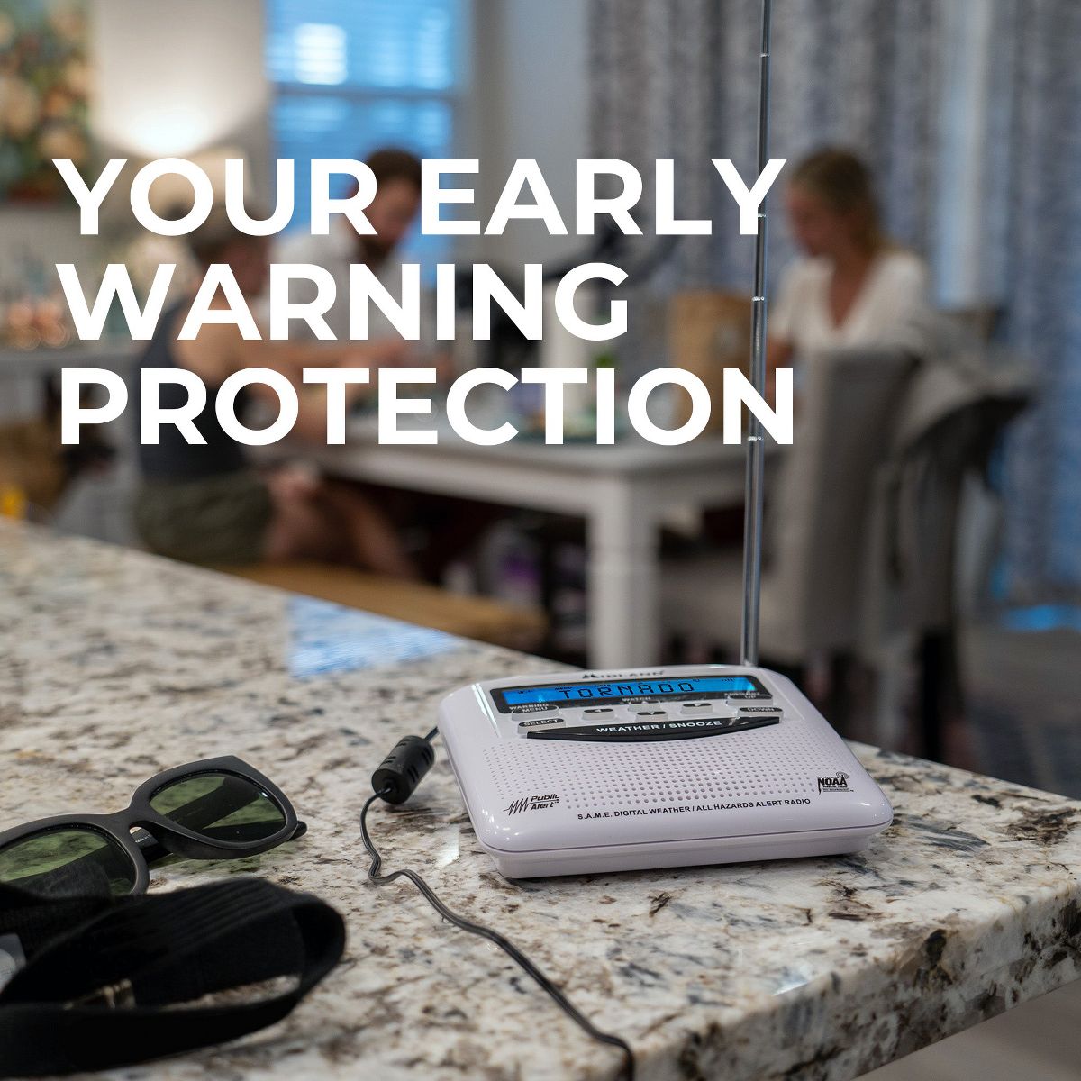 Keep your family safe with the Public Alert -Certified Midland WR120 NOAA Weather Alert Radio. This desktop weather radio features S.A.M.E. localized programming and over 60 weather hazards and public emergency alerts. When a severe weather watch or warning is issued by the National Weather Service, the WR120 automatically alerts you via an audible siren, giving you the ability to take proper action or seek shelter. Power is supplied by an A/C wall adapter, with back-up power from 3 AA batteries for continued operation during power outages. The WR120 also features an alarm clock and instant weather updates for your area at the push of a button. Remember, Early Warning is Your Best Protection®.