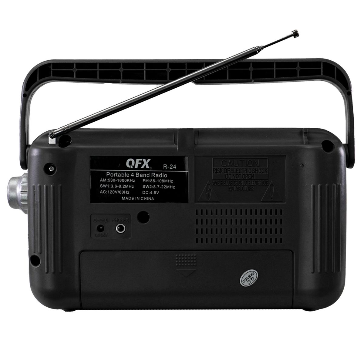 The QFX® R-24 is a 4-band AM/FM/SW1/SW2 radio with built-in 4-in. speaker, telescoping antenna, and headphone output jack. The jack allows you to plug in earphones or headphones to enjoy private listening. This retro shortwave radio operates on AC power or 3 D batteries (sold separately) and has a swivel handle for convenient listening on the go.