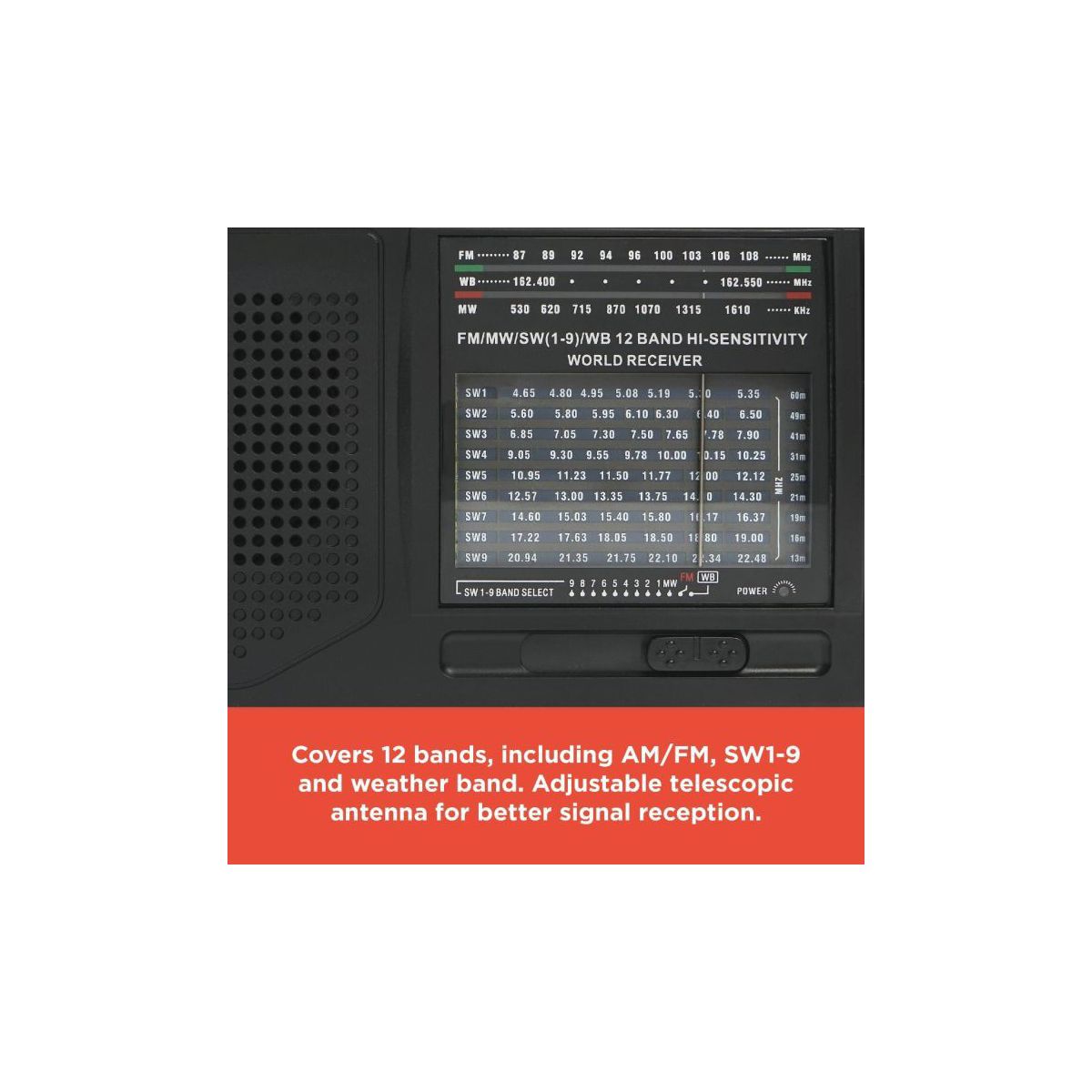 The RadioShack Portable Multi-Band Radio with Weather Band is your dependable source for information, entertainment, and emergency updates, wherever you are. With access to 12 different bands, including AM, FM, SW 1 – 9, and dedicated Weather Band channels, it puts global and local broadcasts at your fingertips. Whether you’re relaxing at home, camping off-grid, or navigating a stormy night, this compact receiver helps you stay connected when it matters most. Its high-sensitivity tuning and long-range reception are enhanced by a telescopic antenna, delivering consistent signal strength across varied frequencies. The built-in loud speaker ensures clear audio, while the 3.5mm earphone jack offers private listening. Designed for practical use, it weighs just 320g and fits easily in a bag or emergency kit. Powered by two D batteries (not included), it offers freedom from chargers or outlets, making it ideal for travel, outdoor adventures, and unpredictable situations. Simple to operate, ruggedly built, and thoughtfully designed, this multi-band radio offers versatility, reliability, and peace of mind all in one.