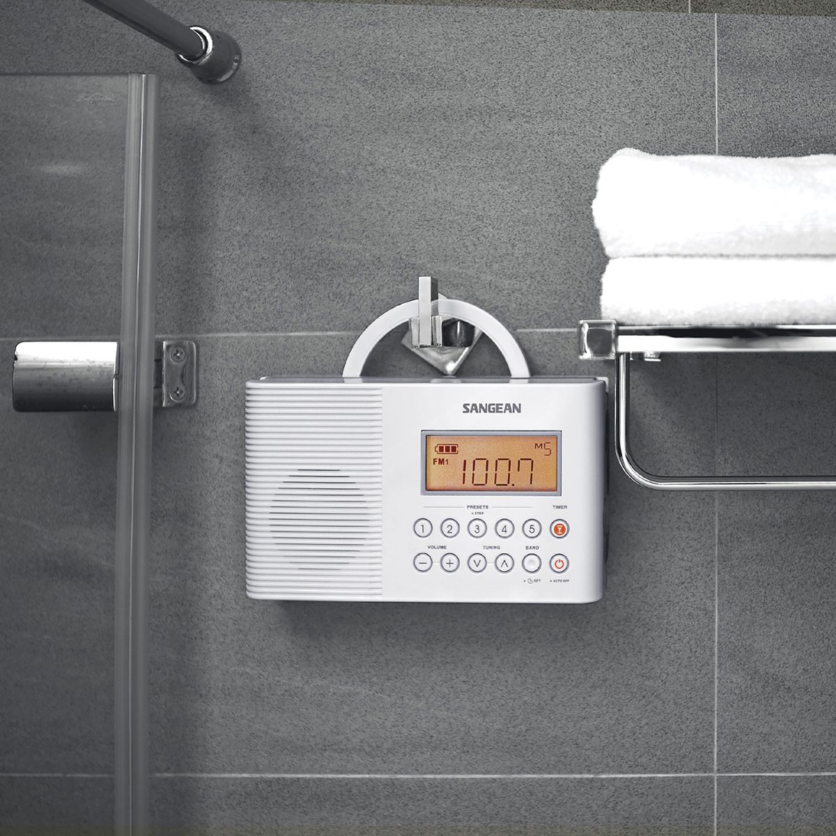 People often ask, "What makes Sangean better than the rest?" This shower radio is the answer. The H201 Portable AM/FM/Weather-Alert Water-Resistant Shower Clock Radio has a stylish design, clean features, and excellent station reception thanks to its built-in AM antenna and pigtail FM/WX antenna. But Sangean took it a step further by making it so water-resistant it's almost submersible! It also has a 2-watt speaker, an emergency LED light, and is a Public Alert certified radio so you can count on it to sound the alarm in times of weather emergencies. The H201 also has an adjustable sleep timer and an adjustable short timer. It includes a wall-mounting bracket, a swivel handle, and an adjustable carrying/hanging strap. This radio uses 2 D batteries or an AC power adapter, which are sold separately.