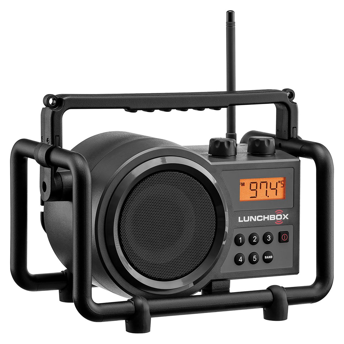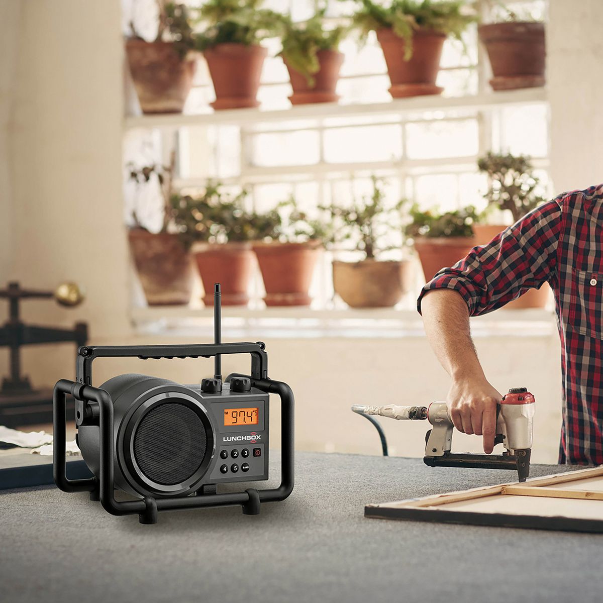 The Sangean LUNCHBOX is made for those who enjoy their music while at a jobsite. This compact, Yellow FM/AM Ultra-Rugged Utility Worksite Digital Radio includes leading-edge features. It has 5 easy-touch memory presets for each of your favorite AM/FM stations. The LUNCHBOX resists water, dust, and shock, making it ideal for outdoor use. Its 5-1/4 in. speaker is high powered and water-resistant while the ruggedly designed rotary tuner and volume control make the radio easy to use. The jobsite radio is surrounded by a roll cage while its ABS plastic material adds to its overall toughness. It can even run on 4 C batteries (sold separately) if using included 8.8 ft. AC cord is not practical.