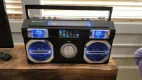 Reminiscent of the boomboxes of old, this portable CD Player with FM Analog Radio also includes Bluetooth connectivity for streaming music. The front loading CD player is CD-R/RW compatible. This unit comes with an auxiliary input jack and headphone jack. Other great features include built-in stereo speakers, rotary volume control, treble and bass adjustments and a convenient carrying handle. A multi-color LED Equalizer adds an exciting visual to this awesome looking unit. There is also a built-in AC transformer and built-in rechargeable battery.