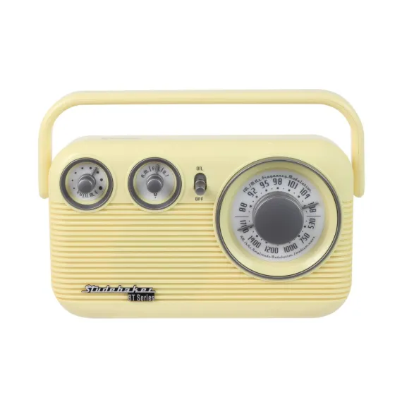 The Studebaker SB2003BT AM/FM radio is a retro portable radio with classic styling, and easy to use features. The large analog tuning knob simplifies adjusting to your favorite stations, along with AM/FM and volume knob controls as the speaker delivers excellent sound with clear and static-free audio. Play music from other devices like your tablet, iPod®, MP3 player or other digital audio players through the built-in auxiliary input jack, connect your devices with Bluetooth compatibility or even listen in peace, connecting your favorite pair of headphones using the built-in 3.5mm headphone jack. The compact, durable design features a carrying handle and telescopic antenna. It operates on 120V AC or on 4 x "C" batteries (not included),and makes the radio perfect for taking with you anywhere you go.